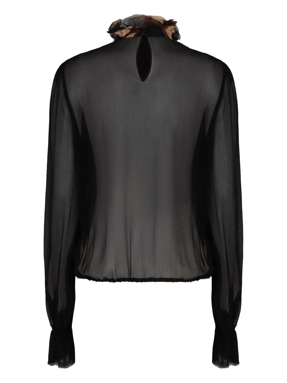 чёрный, оборчатый воротник, рукава-фонарики, структурированные манжеты, полупрозрачный, каплевидный вырез на спинке