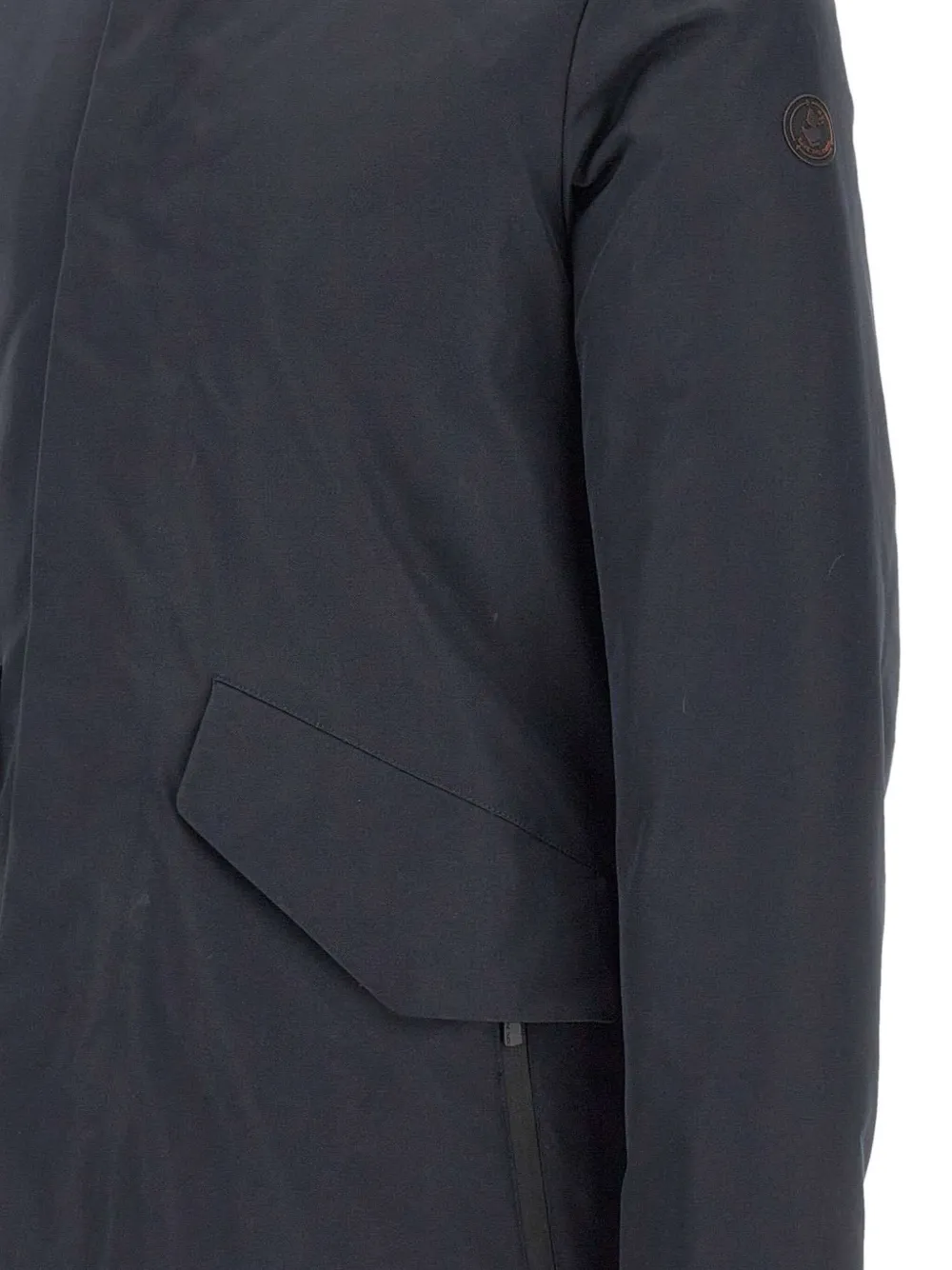 синий цвет, капюшон на шнурке, четыре передних кармана, двойная застежка-молния, застежка на пуговицы, нашивка с логотипом на рукаве