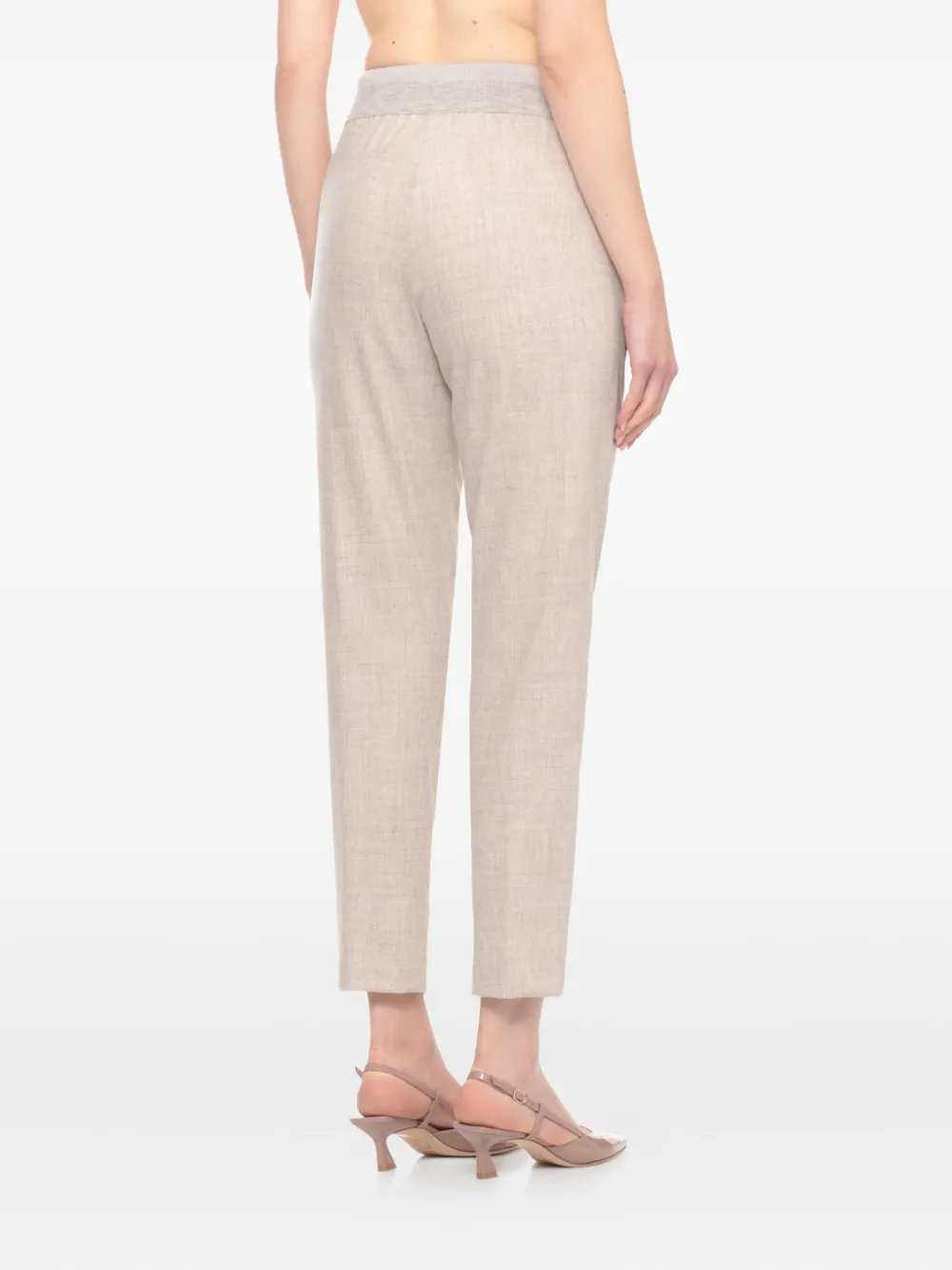 бежевые зауженные брюки с высокой талией, эластичным поясом и завязками