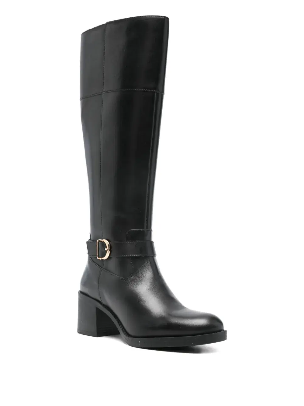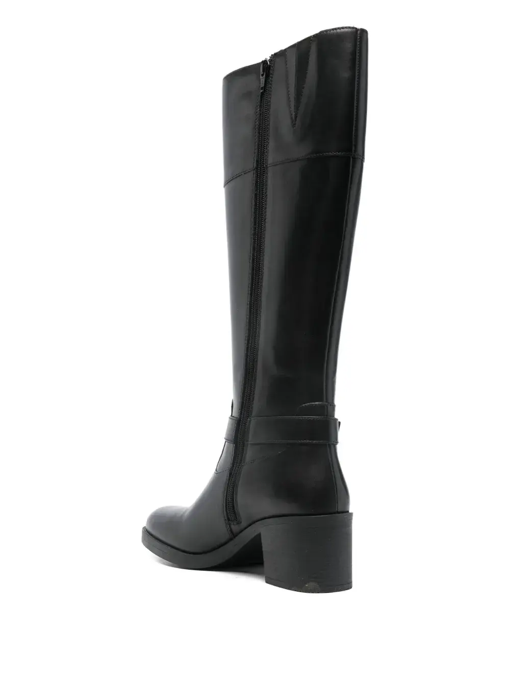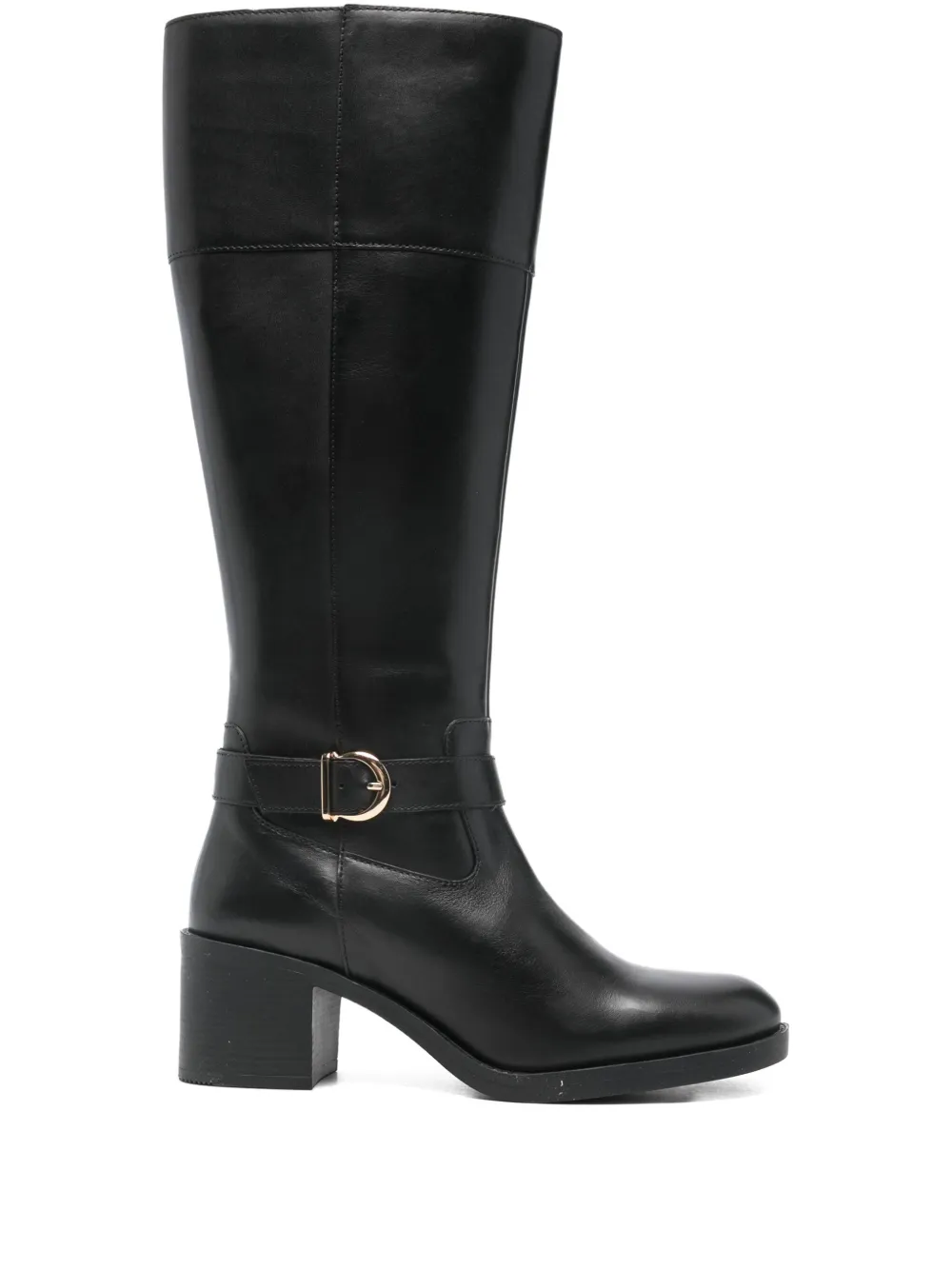 черные кожаные высокие сапоги до колена на блочном каблуке с ремешком на пряжке и застежкой-молнией