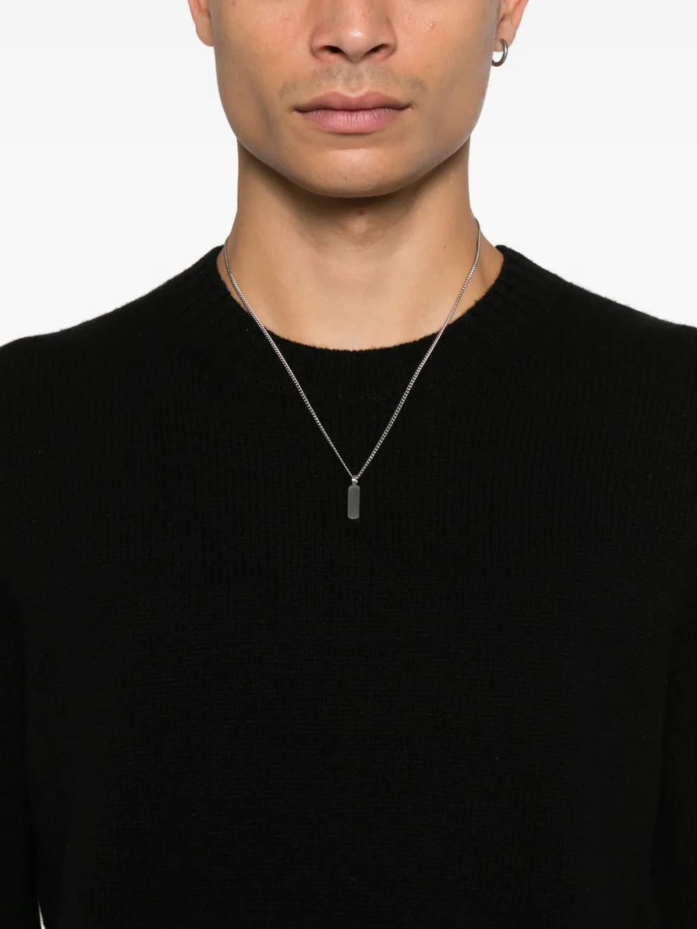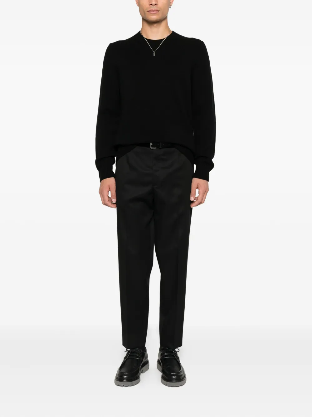 чёрный джемпер с круглым вырезом, длинными рукавами, ребристыми краями и манжетами, тонкой вязки