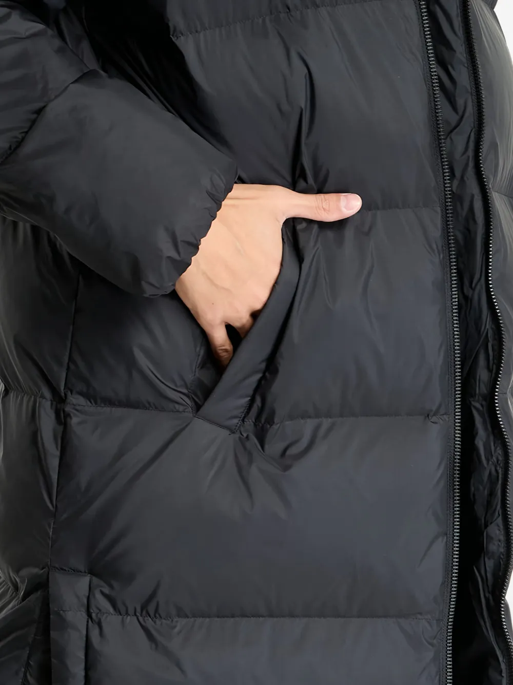 черная стеганая куртка с капюшоном, застежкой на молнии и логотипом
