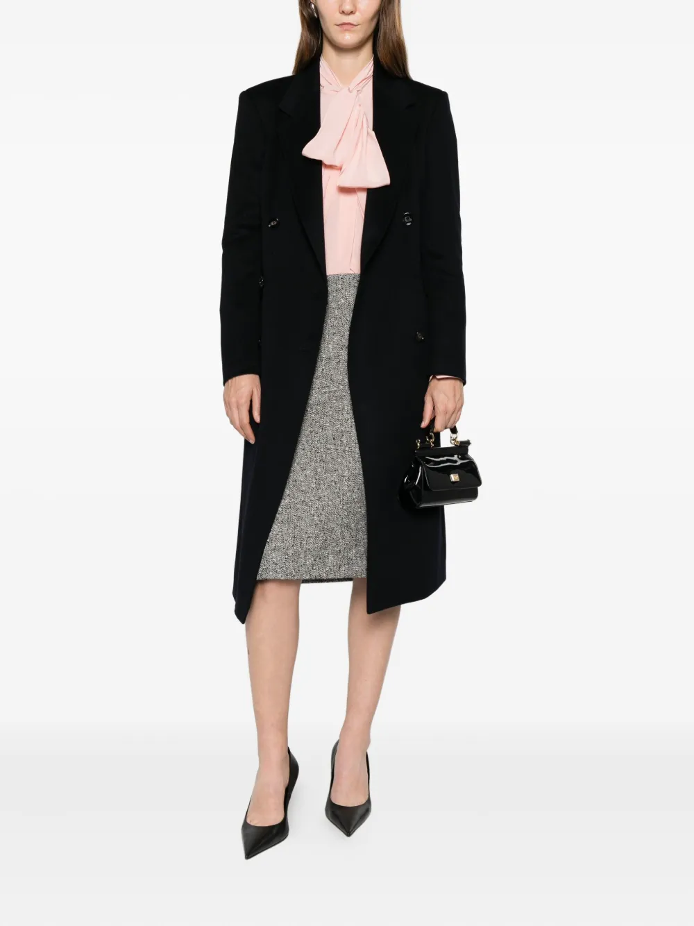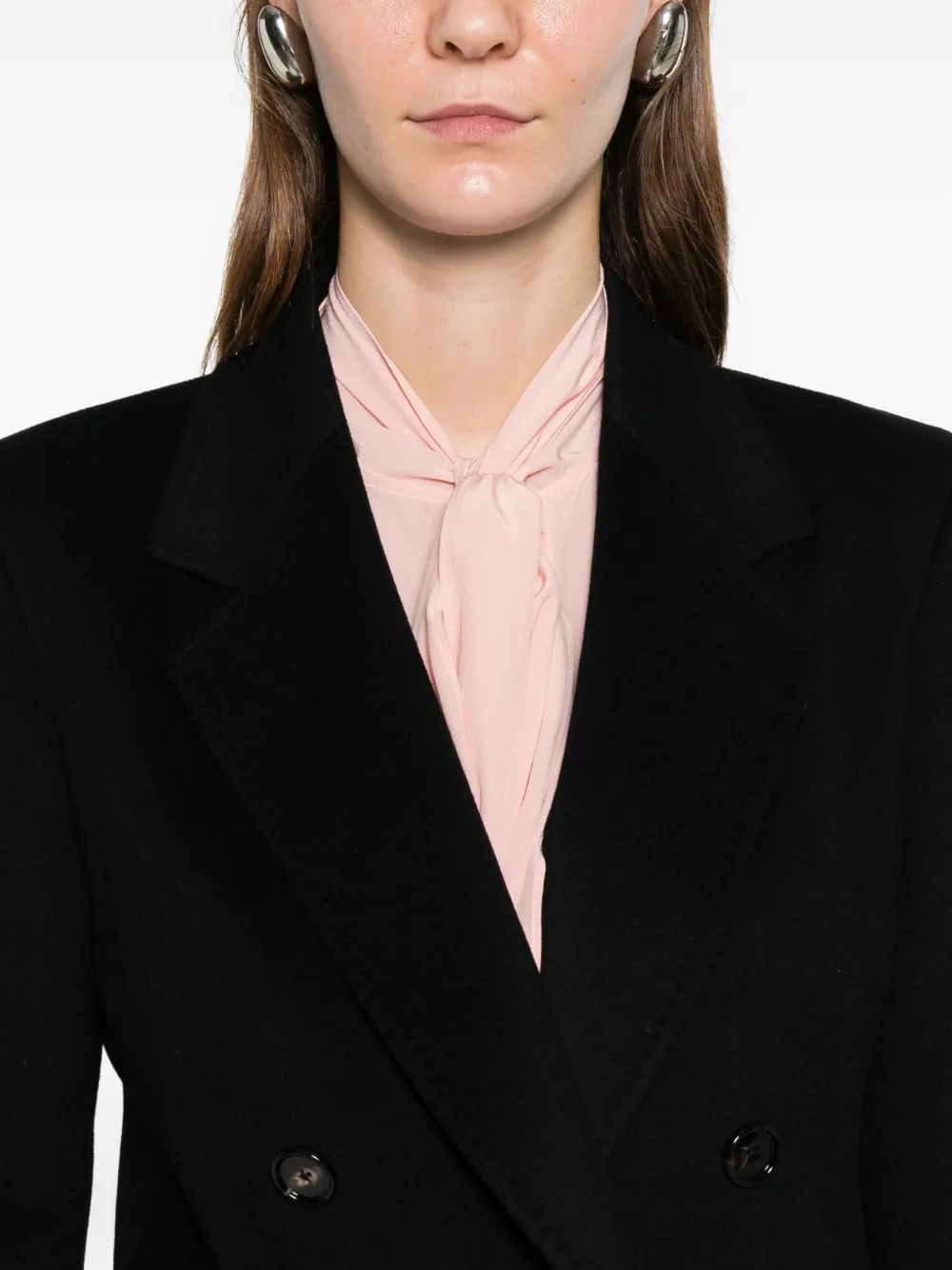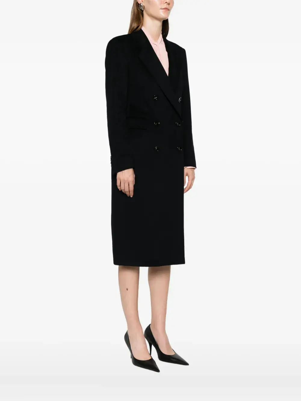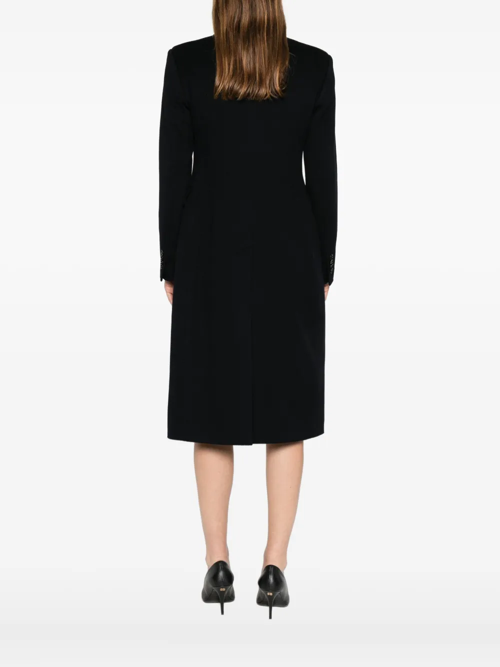 синий двубортный пиджак на пуговицах с лацканами с вырезом, клапанами на карманах, длинными рукавами