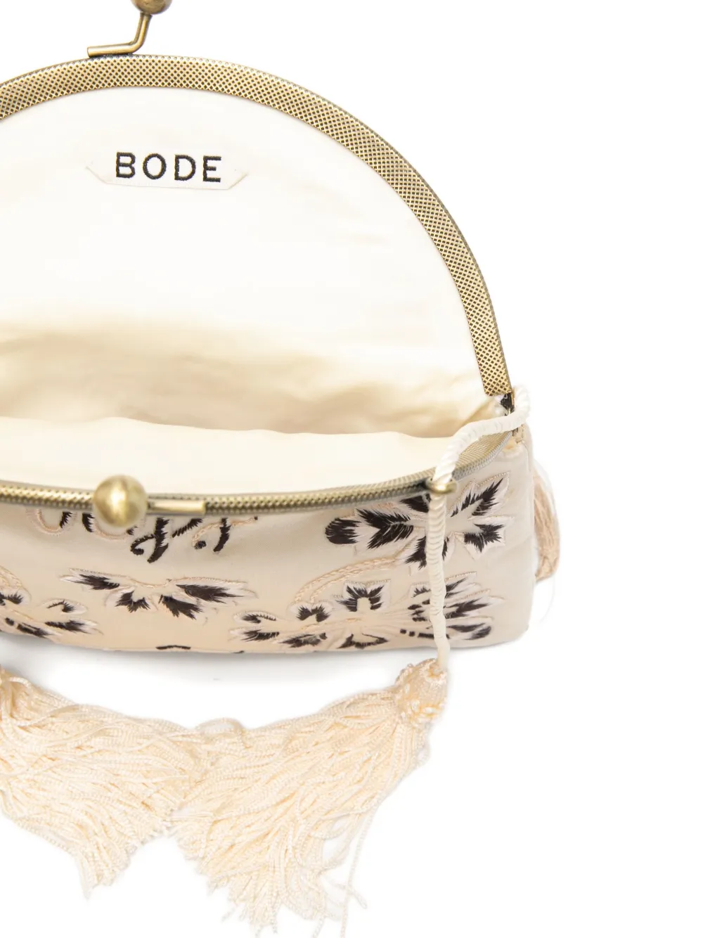 слоново-кремовая сумка с цветочным узором, кисточками, верхней ручкой, рамочной застёжкой и плечевым ремнём-канатом