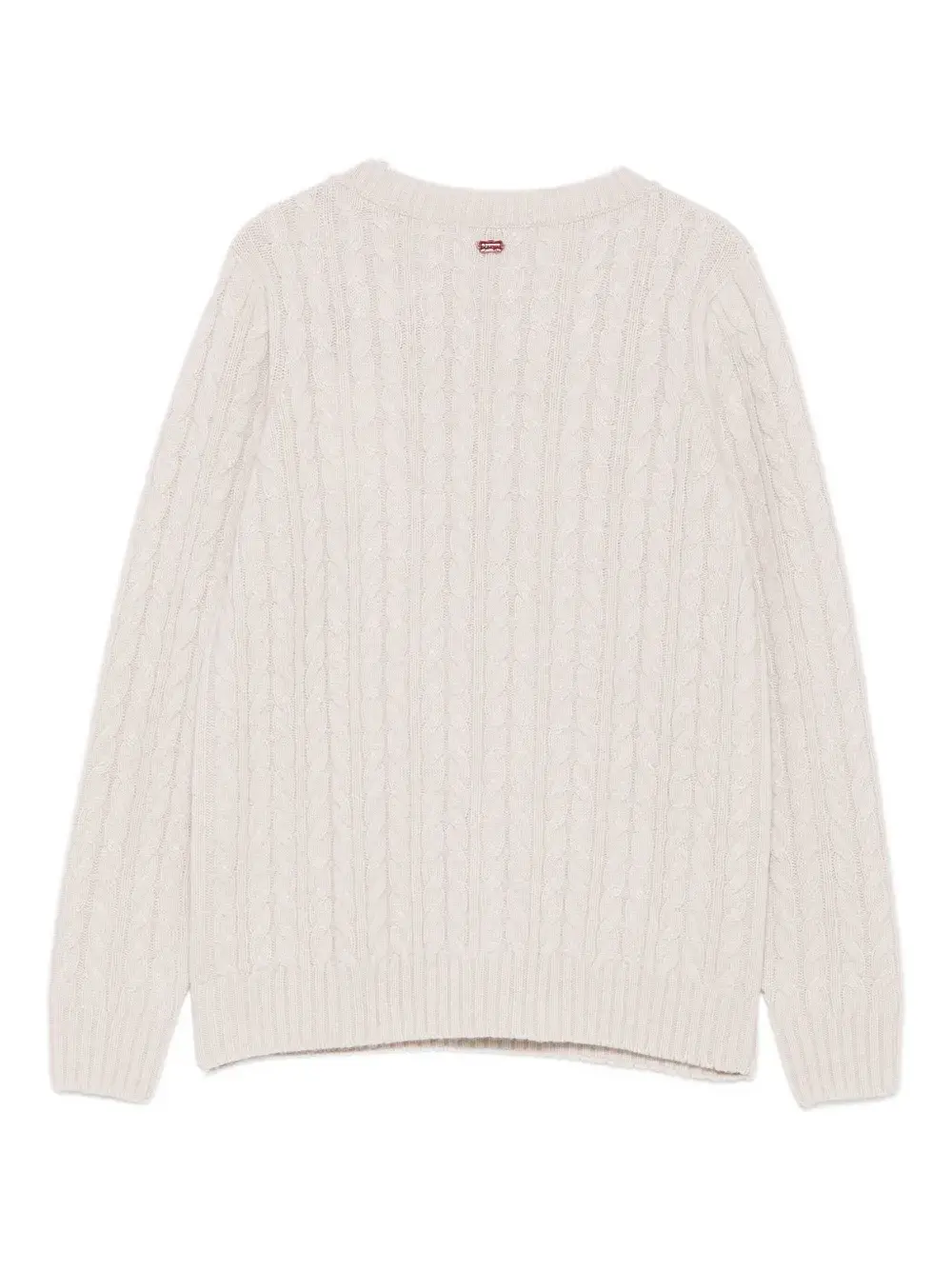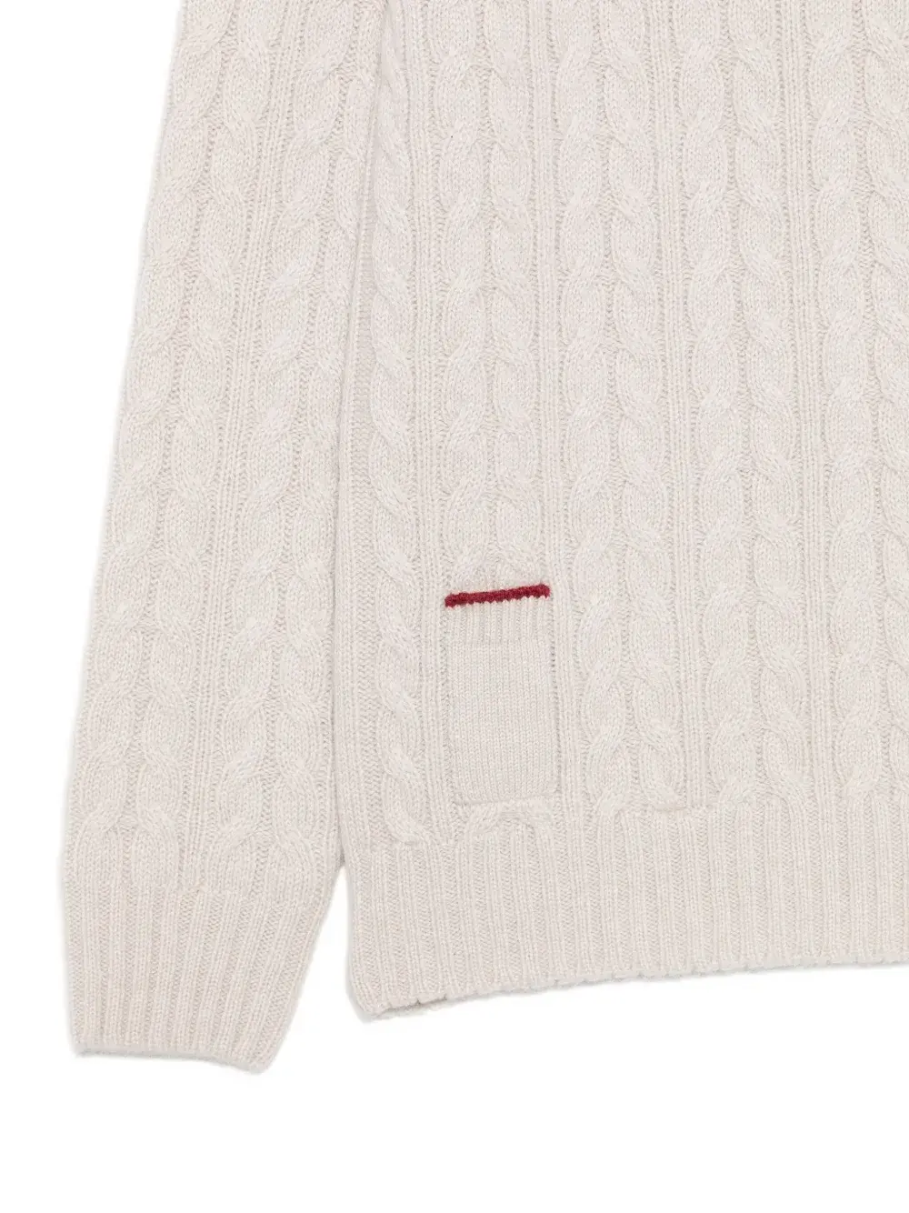 бежевый вязаный свитер косичкой с нагрудным карманом, круглым вырезом и длинными рукавами