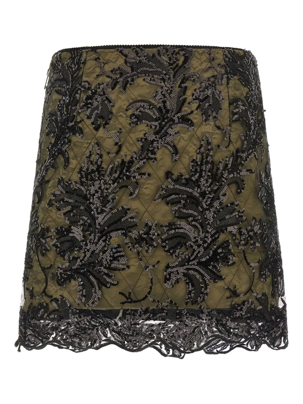 зеленая стёганая ткань с кружевной отделкой, аппликациями из пайеток, асимметричным подолом и застёжкой-молнией сзади