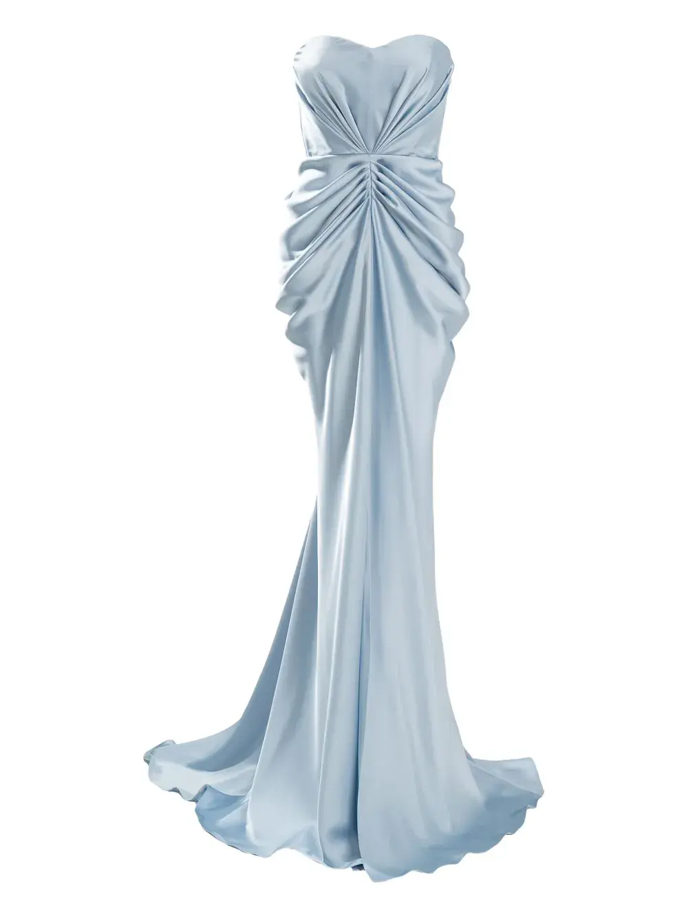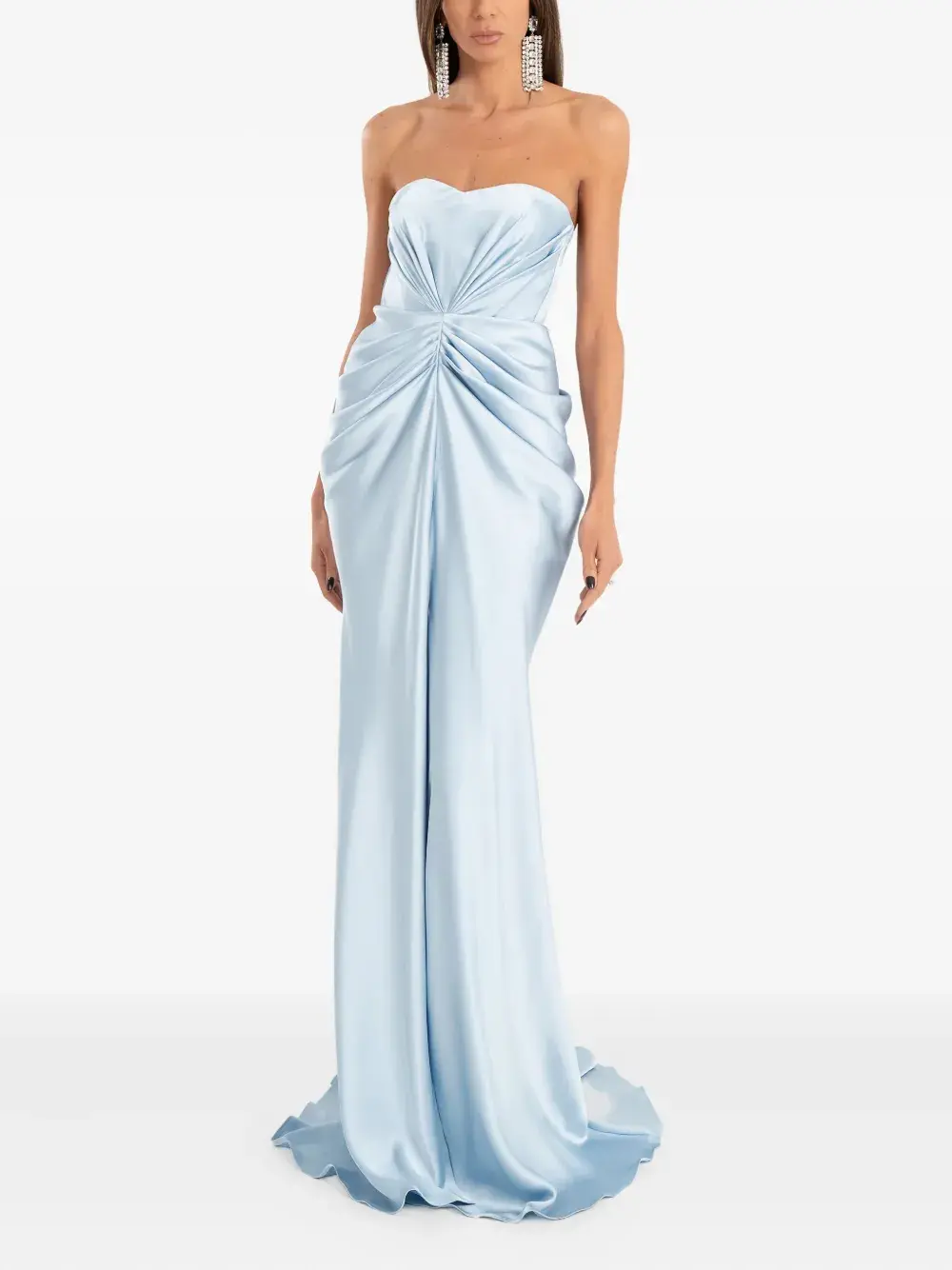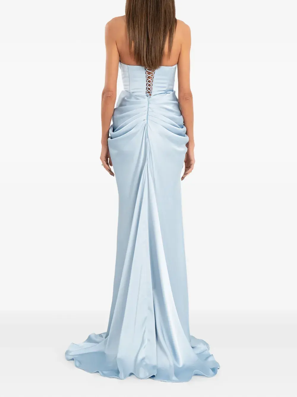 синее платье без бретелек с драпировкой, корсетной вставкой на спине, в пол