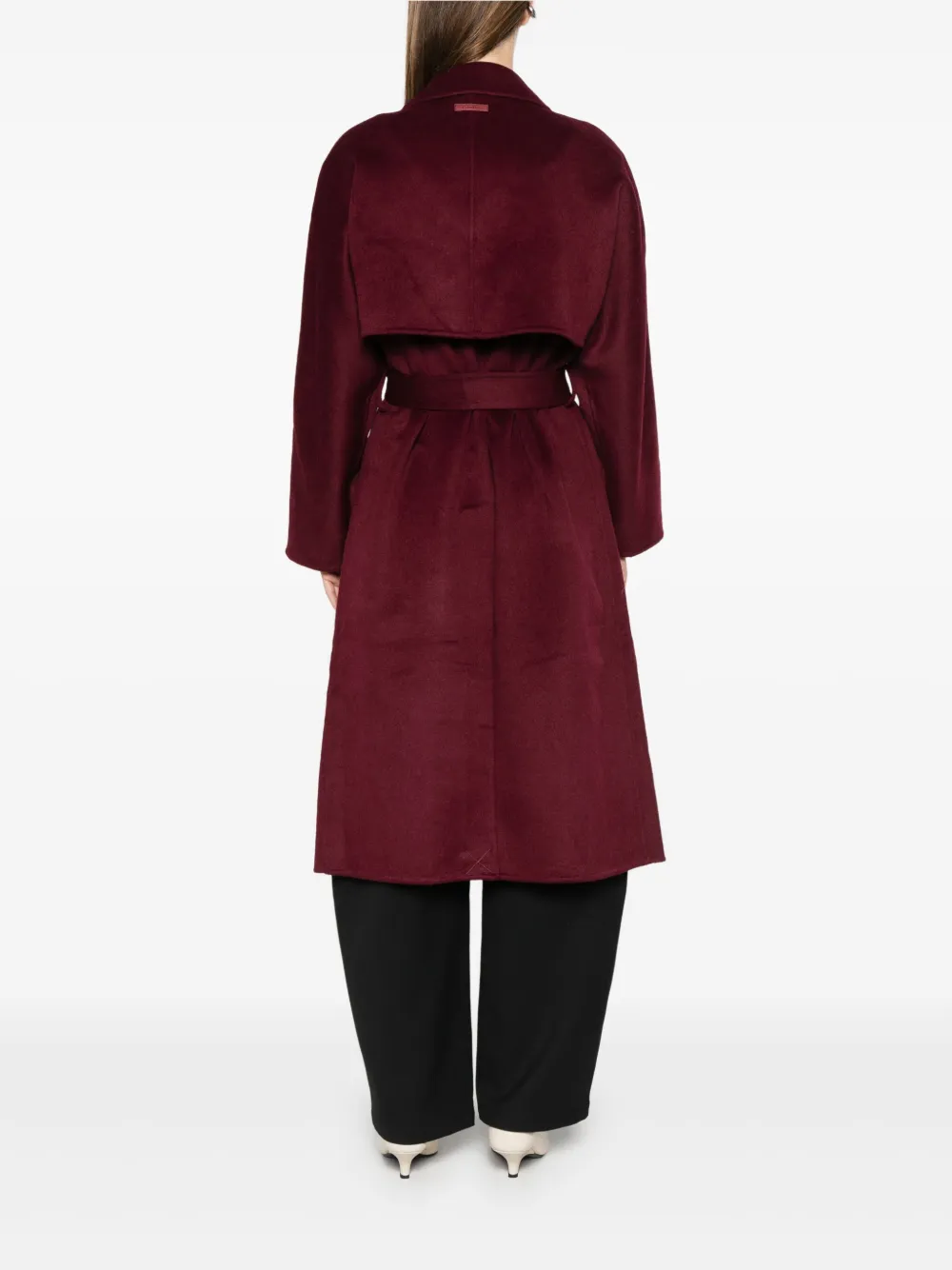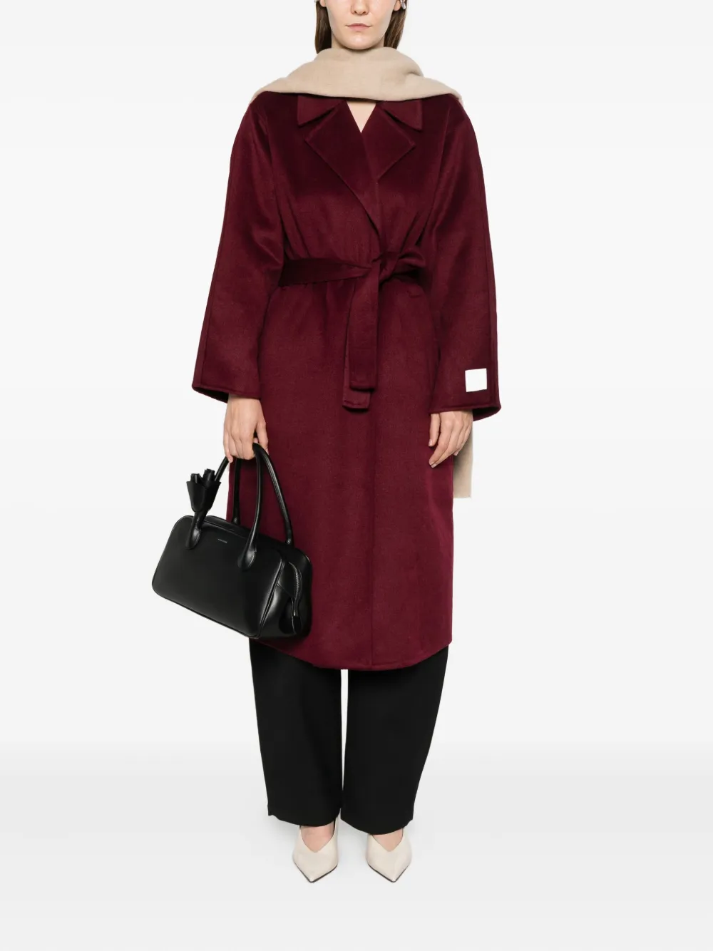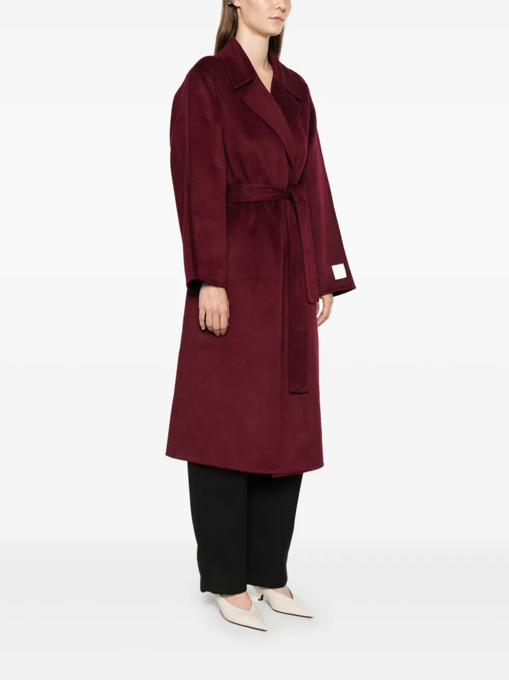 красный пояс, накладные карманы спереди, длинные рукава, лацканный воротник, средняя длина