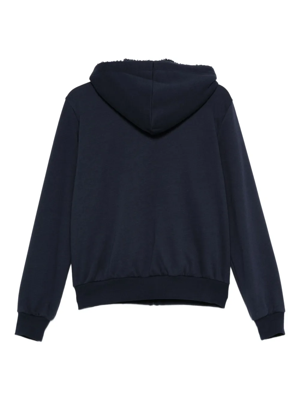 синий худи с нашивкой-логотипом, кулиской, застежкой-молнией, длинными рукавами и ребристыми манжетами