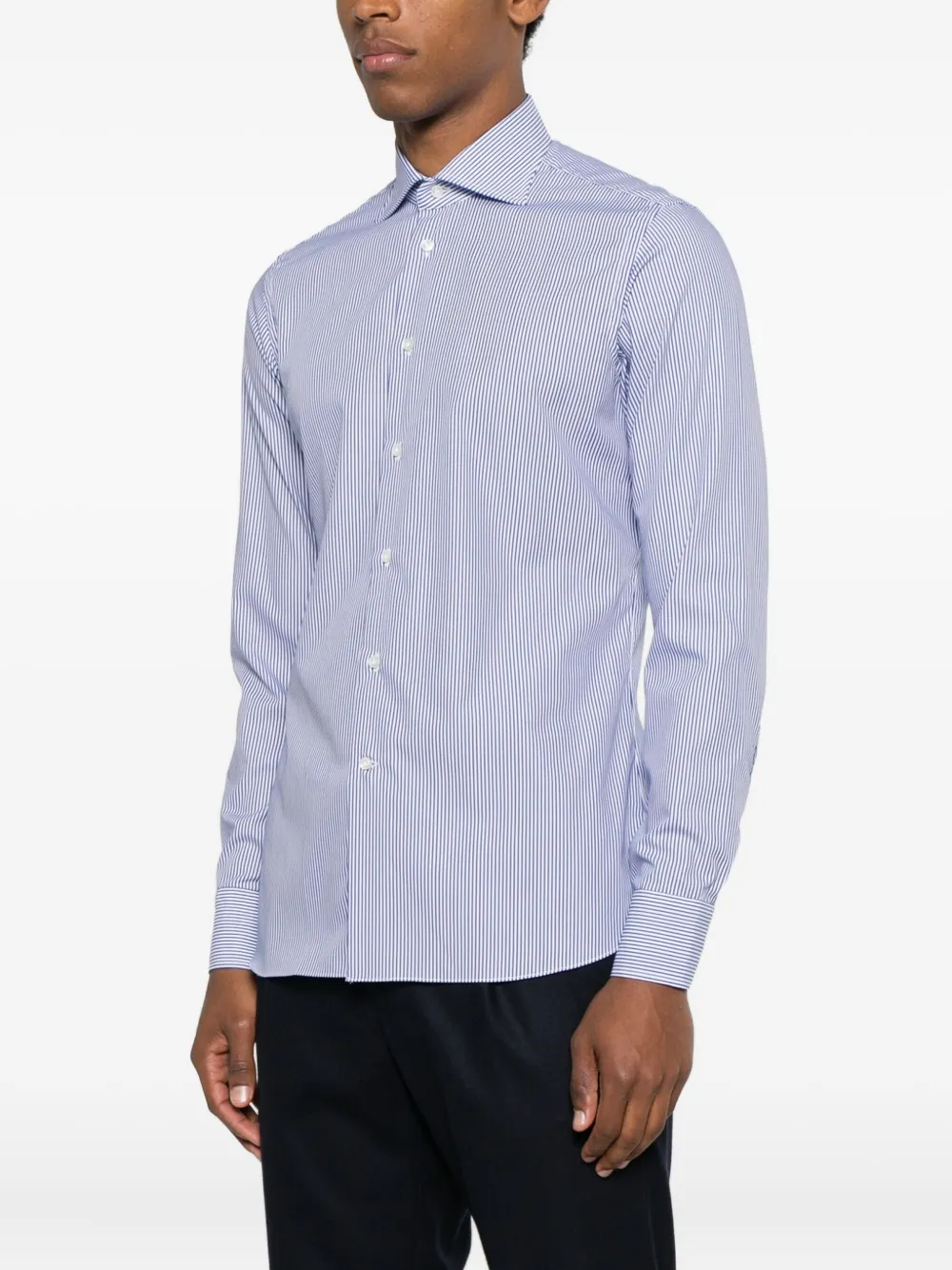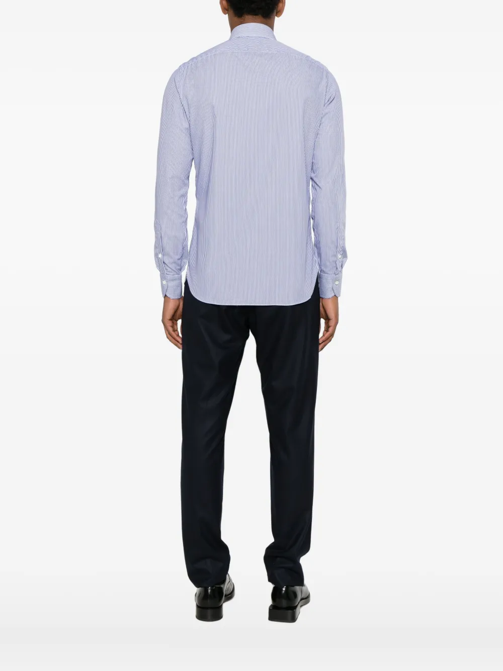 синяя рубашка в полоску с застёжкой на пуговицах, длинными рукавами, манжетами на пуговицах и изогнутым подолом