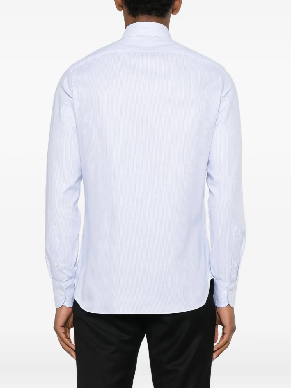 светло-голубой с полосатым узором, застёжка на пуговицах, длинные рукава, манжеты на пуговицах, классический воротник