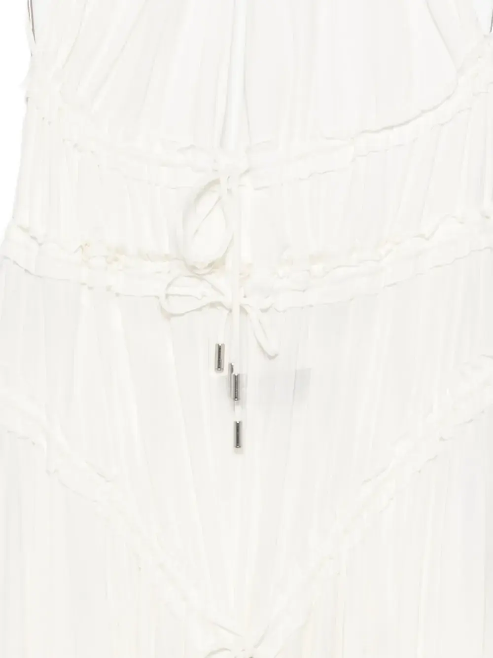 белый топ на бретелях-халтер с тонкими лямками, застёжкой на завязках, плиссированной отделкой, асимметричным подолом и металлическими деталями