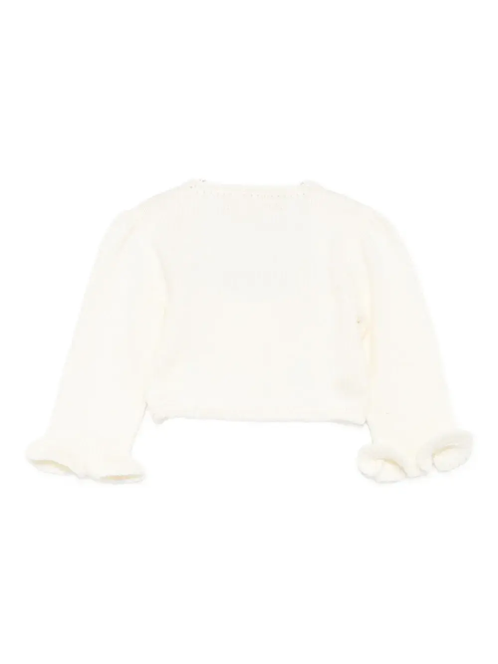 белый вязаный пуловер с круглым вырезом, застёжкой на пуговицы, длинными рукавами и оборчатыми манжетами