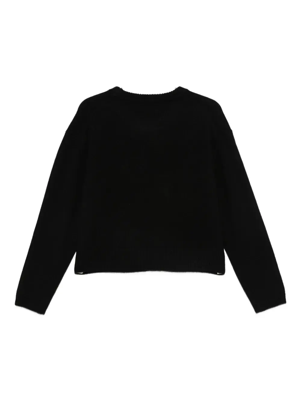 черный свитер с круглым вырезом, длинными рукавами, рубчатыми манжетами, укороченным кроем и заниженной линией плеч