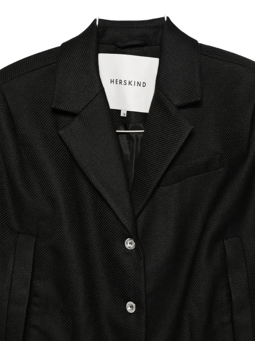 черный цвет, застежка на пуговицы, длинные рукава, накладные карманы с клапанами, вырезы на рукавах, подплечники, лацканы с вырезом, центральная шлица сзади