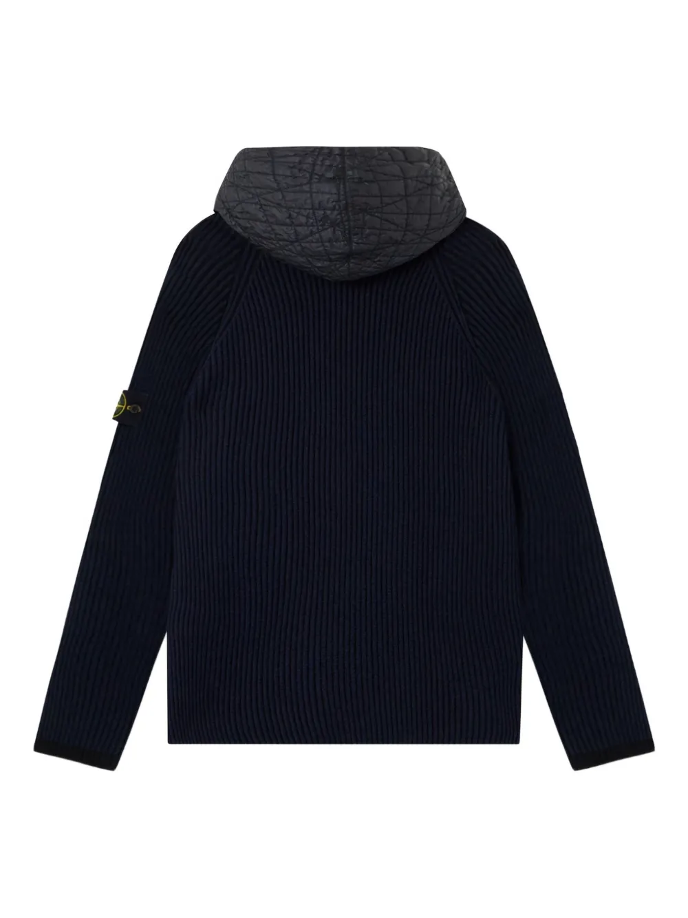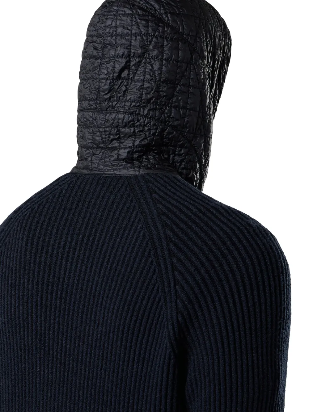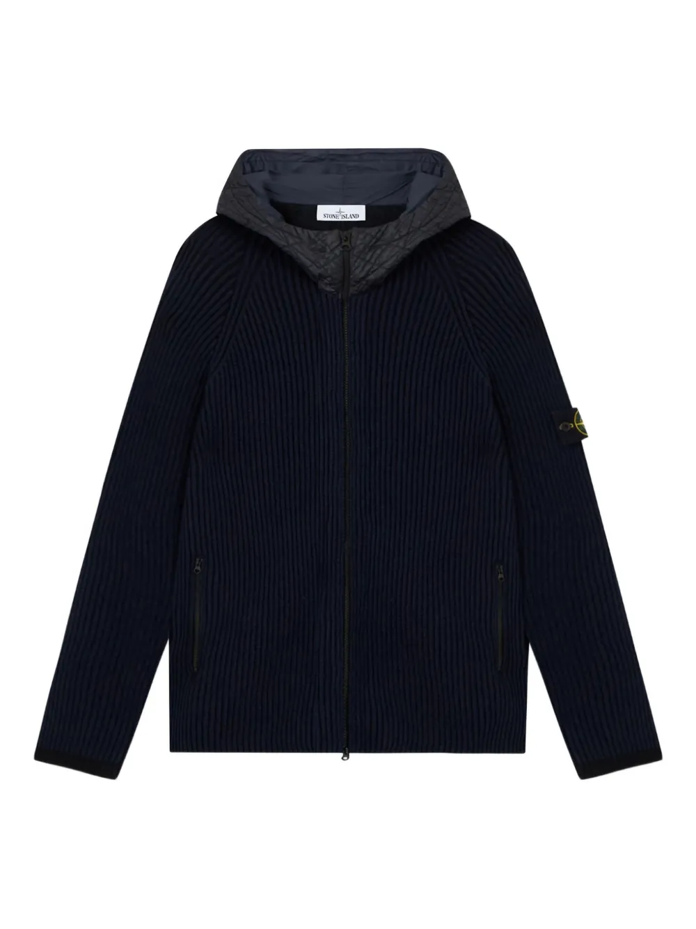 синий в рубчик, вязаный, на молнии, стеганый капюшон, нашивка с логотипом, длинные рукава
