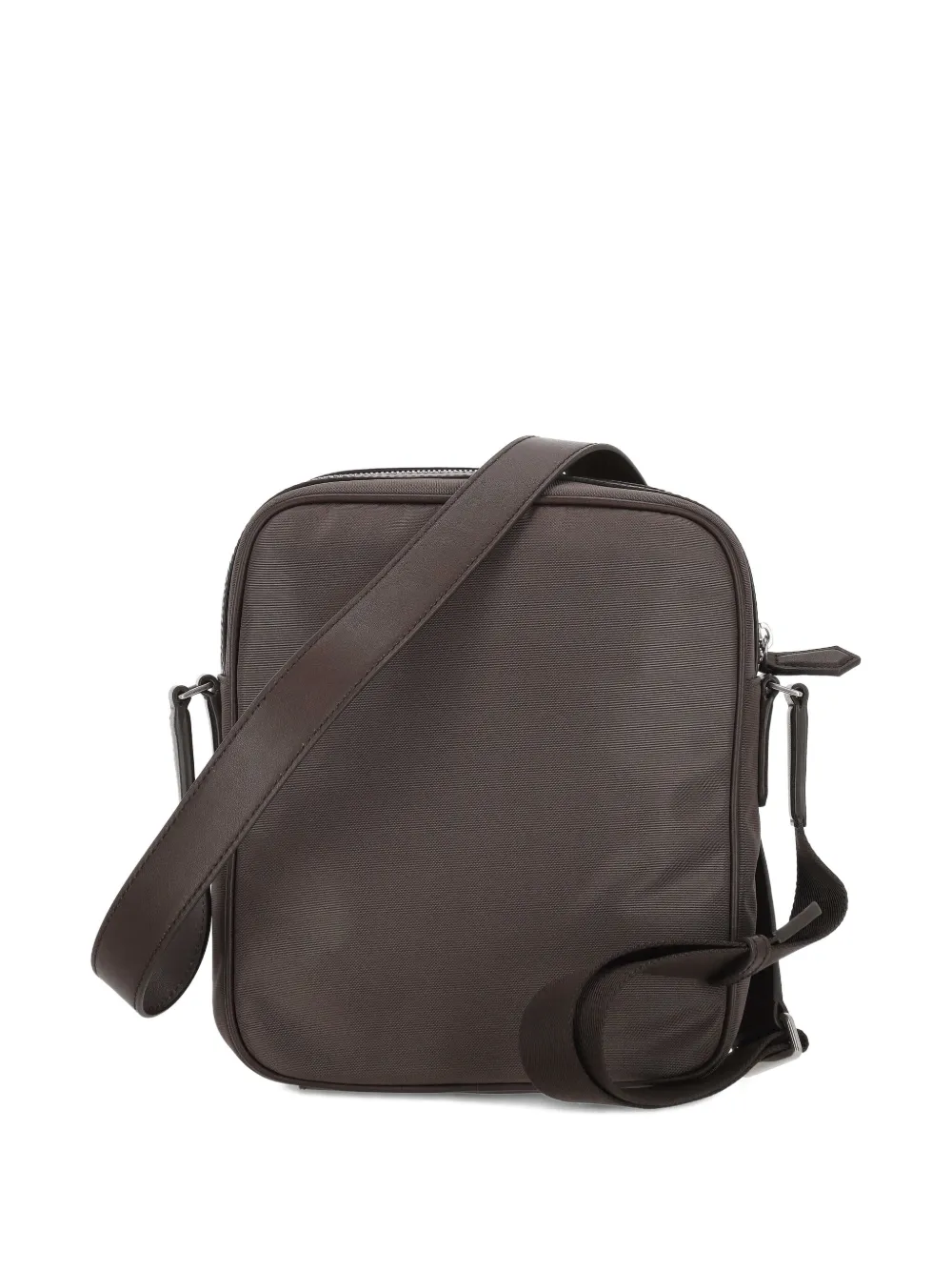 светло-серая сумка с полосатыми деталями, верхней молнией, наплечным ремнем, прямоугольной формой и логотипом