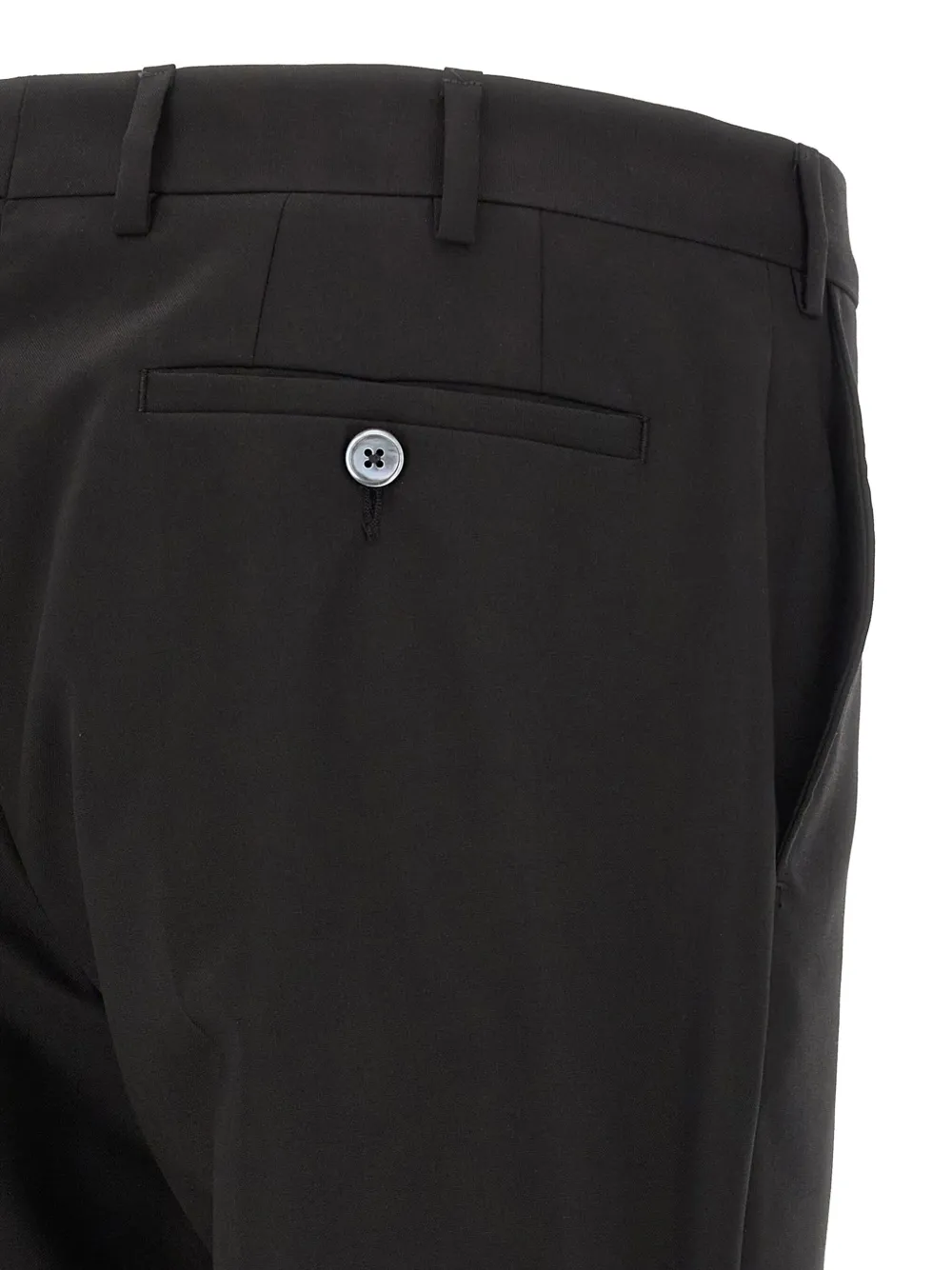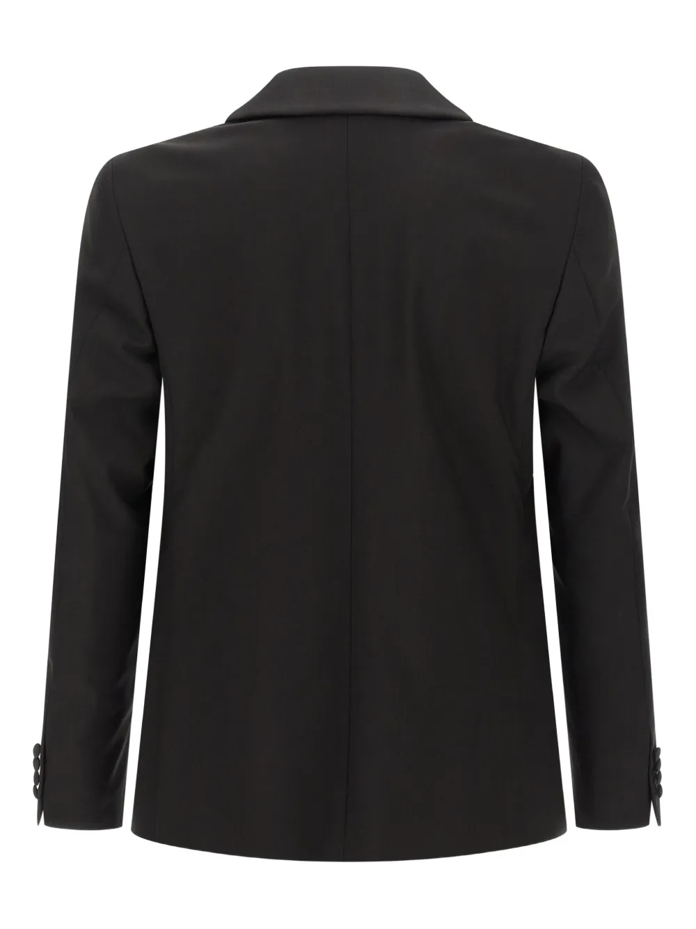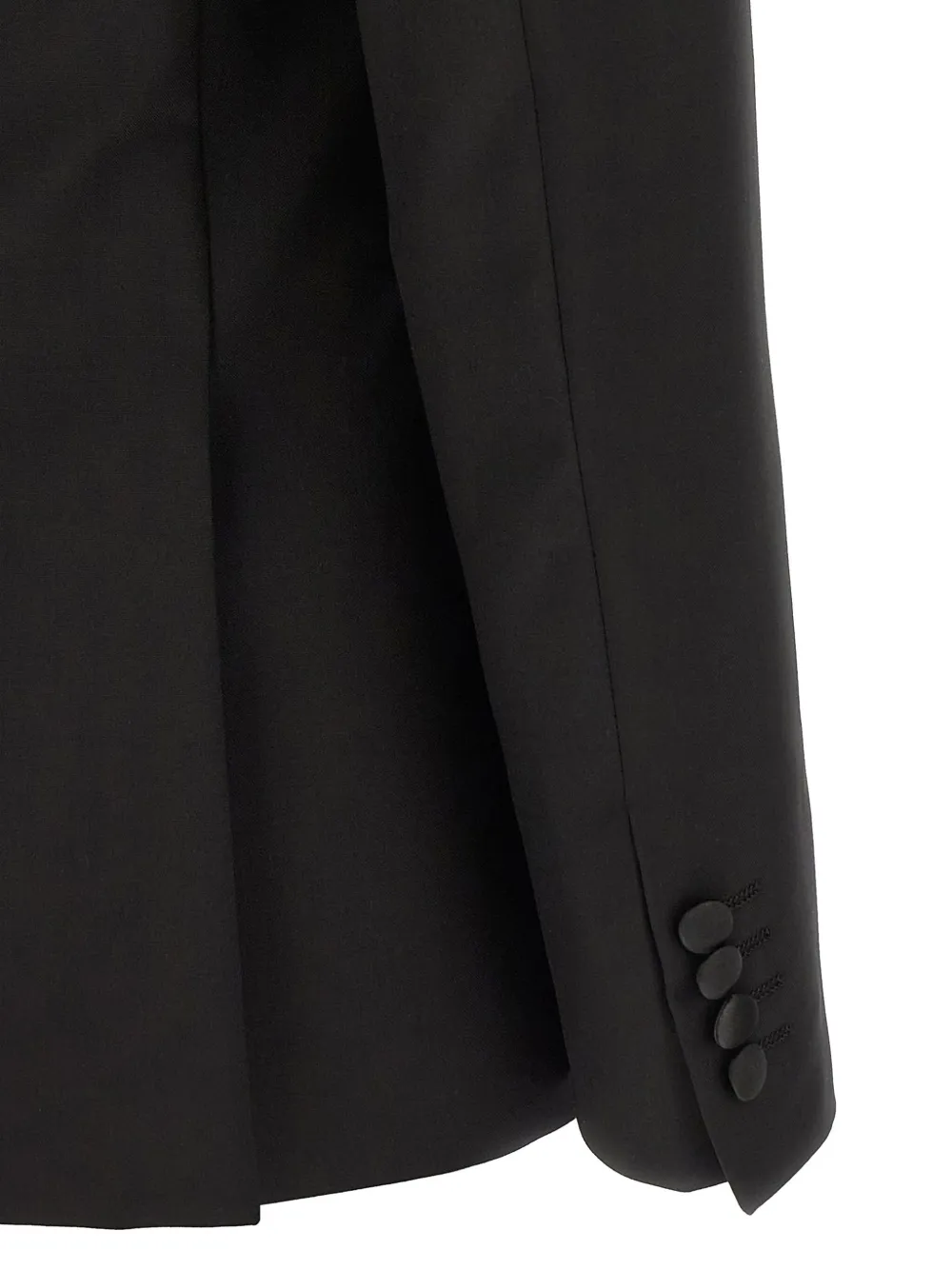 черная шерсть, однотонные сатиновые детали, застежка на одну пуговицу, манжеты с петлями для пуговиц, разрезы сзади
