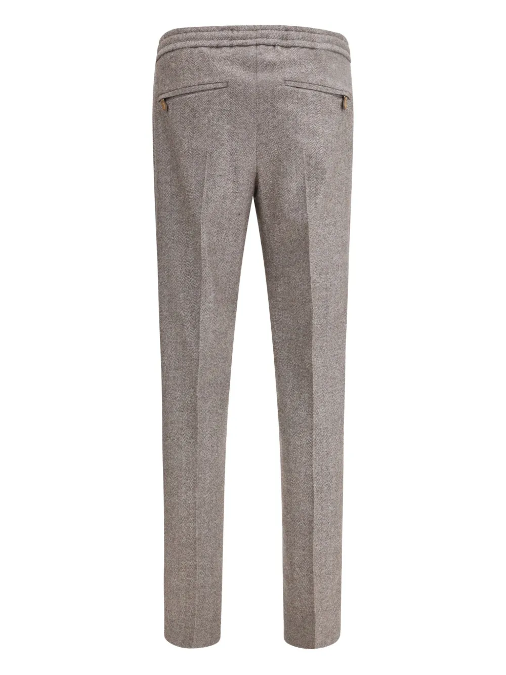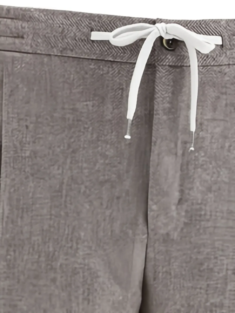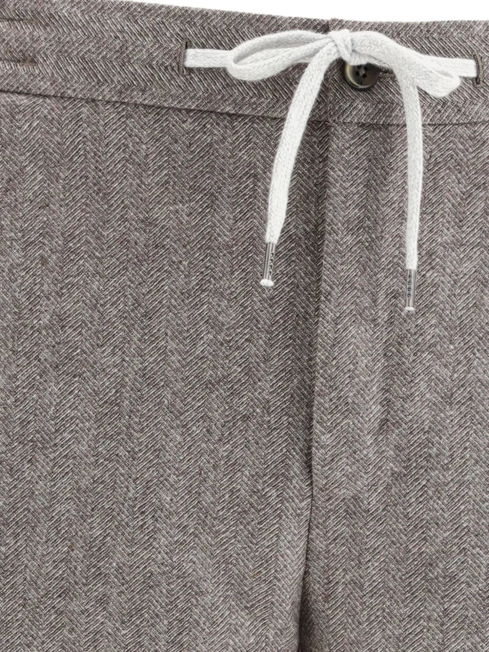светло-коричневый твидовый узор «ёлочка», затягивающийся шнурок, задние прорезные карманы, застёжка на пуговицу, шлевки для ремня