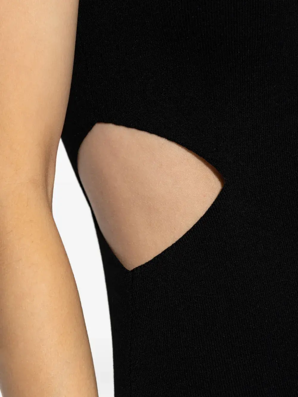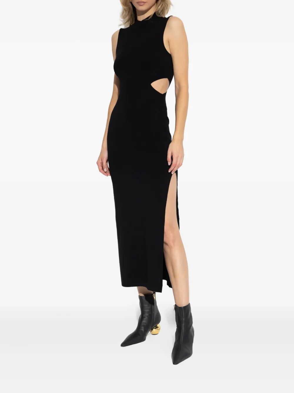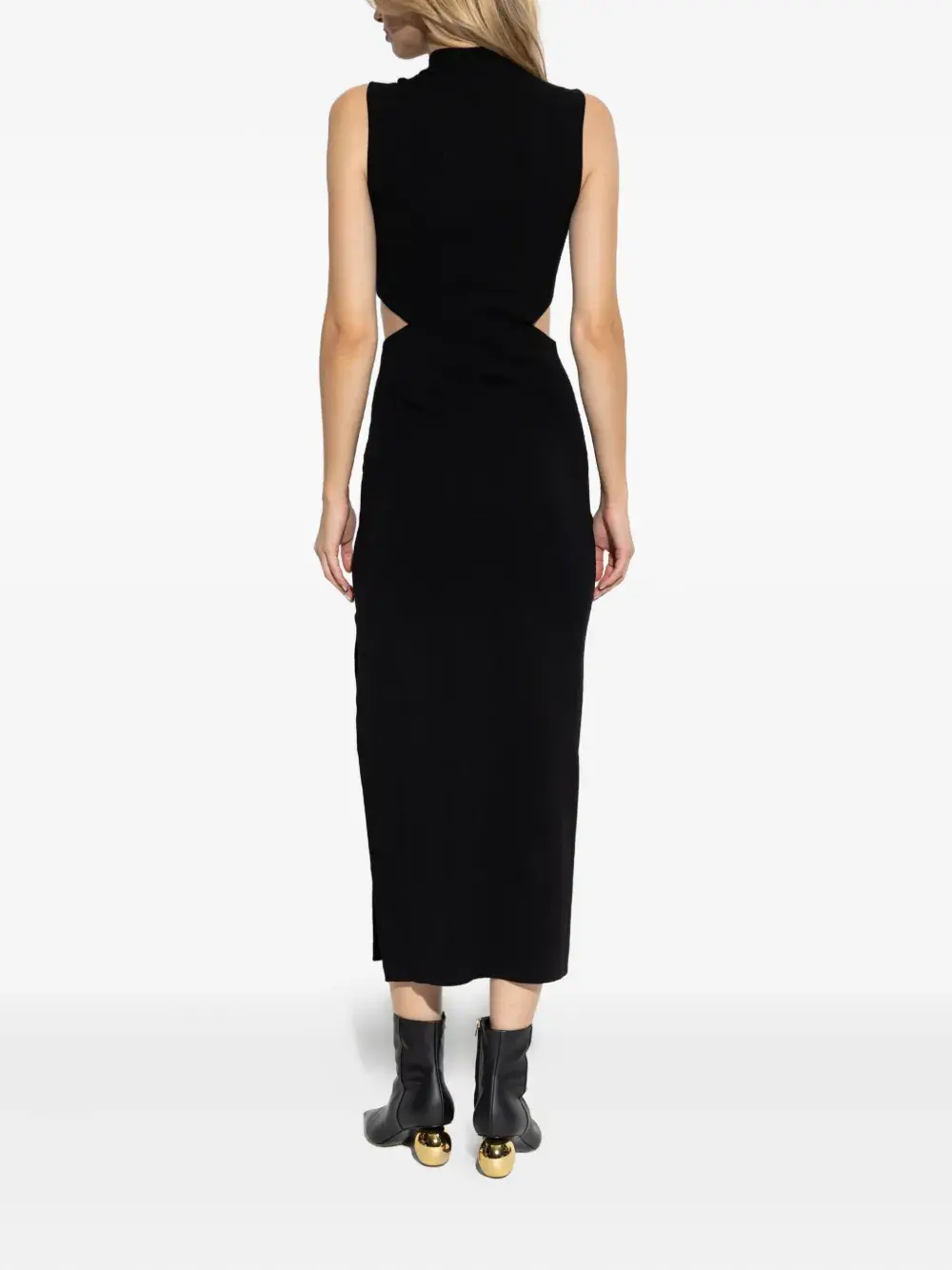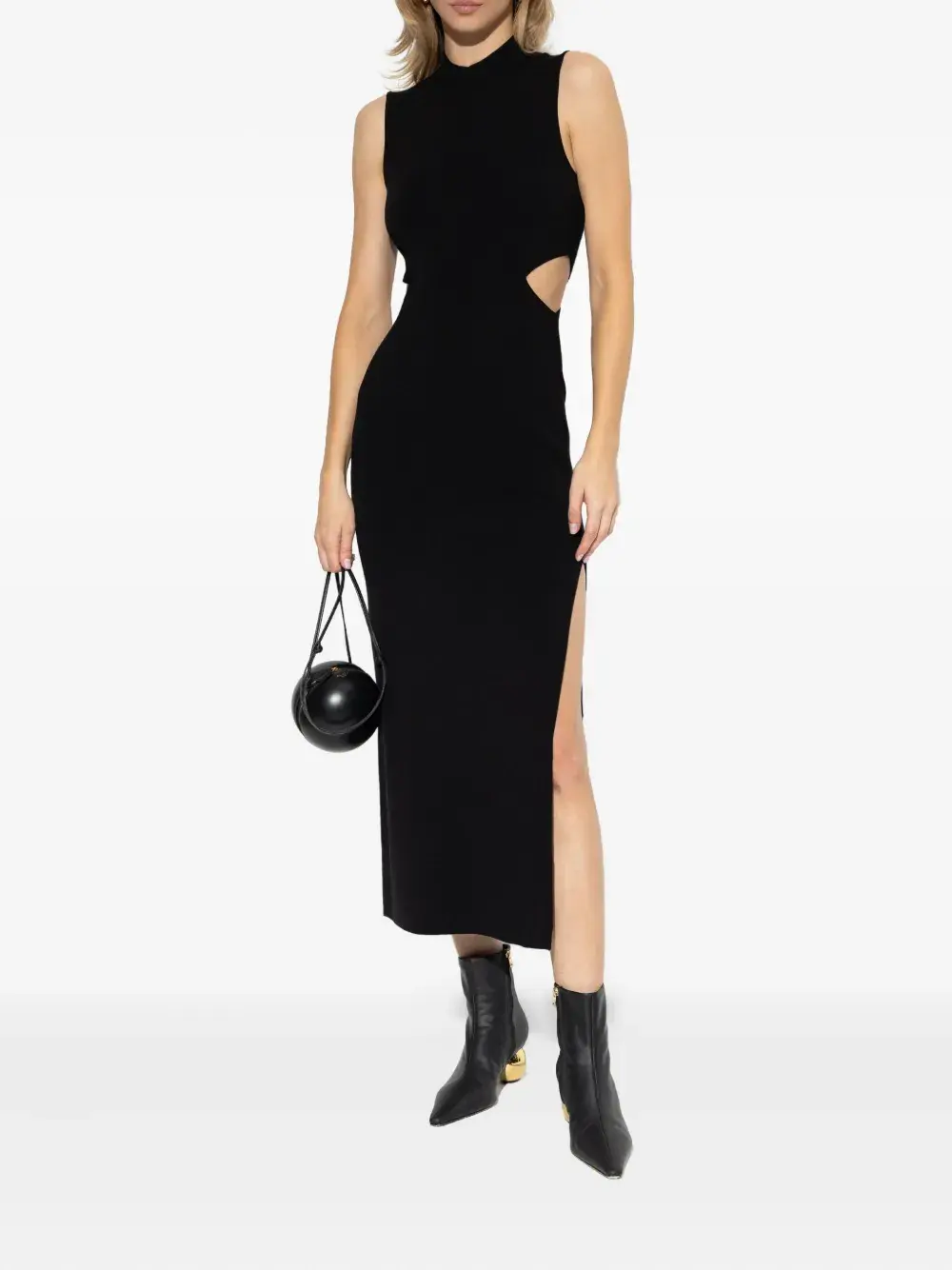 черное платье миди длины без рукавов с вырезами и воротником-стойкой