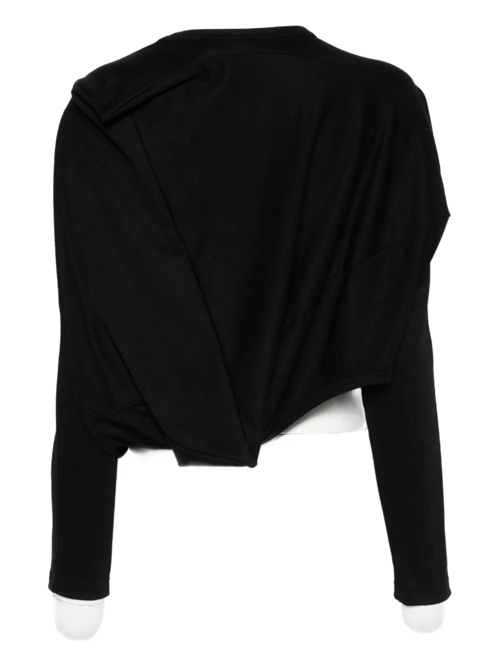черный топ с многослойными деталями, длинными рукавами и круглым вырезом