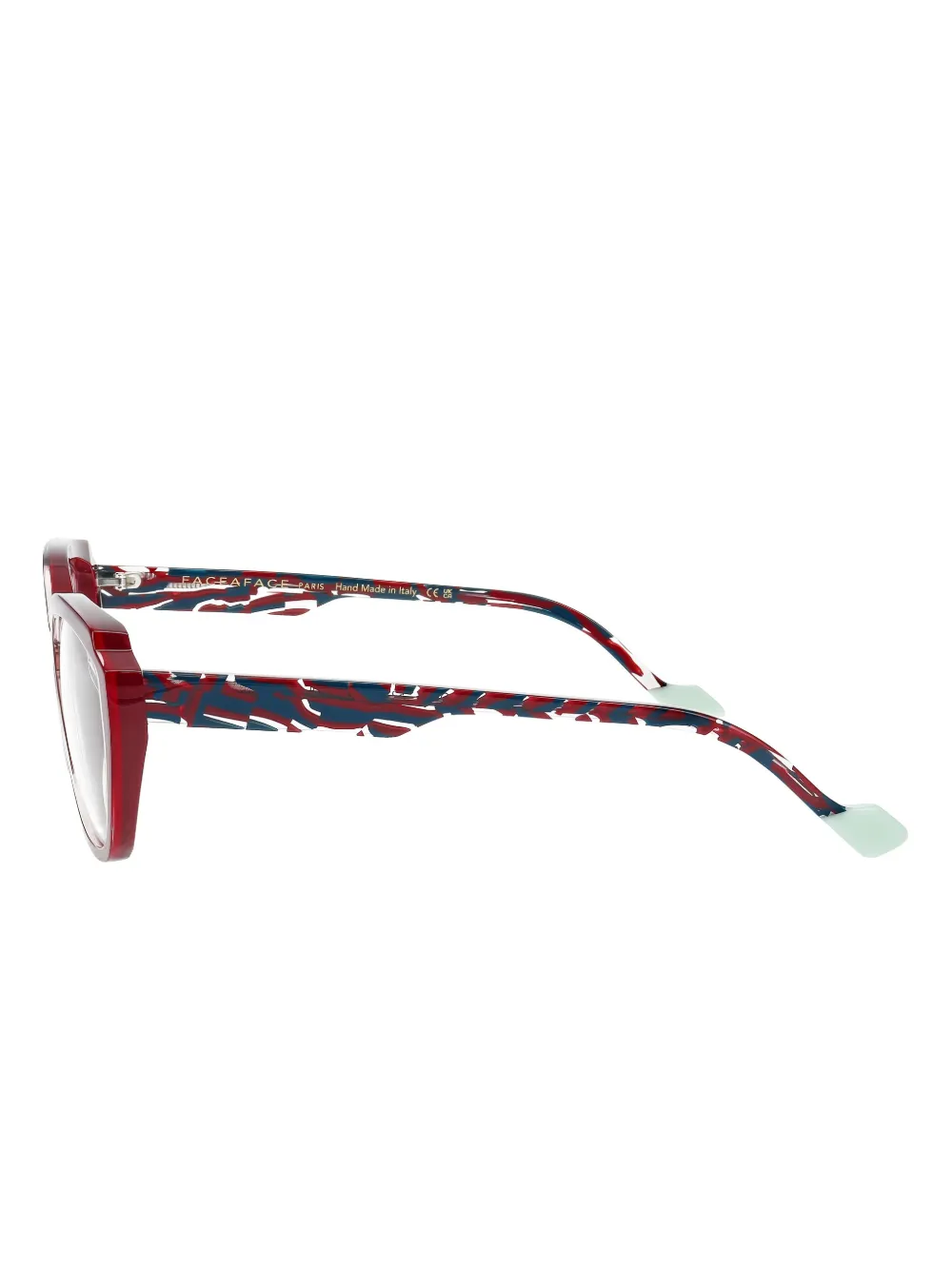 красная оправа геометрической формы, дужки с узором, мятно-зеленые наконечники, носовые упоры, все очки на FARFETCH продаются без диоптрий, в комплекте защитный футляр