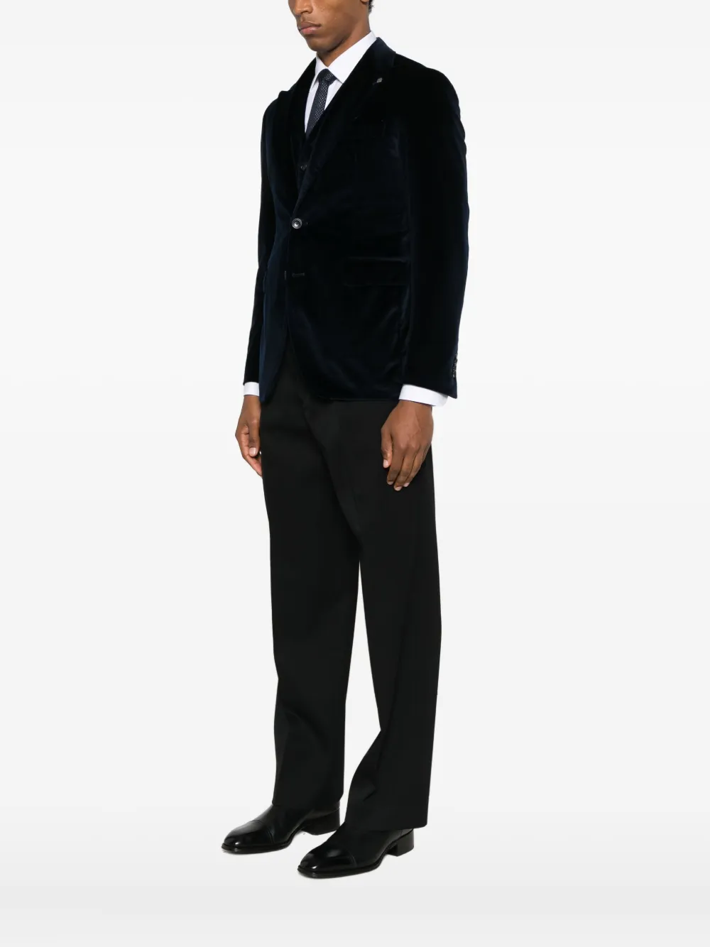 черные заострённые лацканы, застёжка на пуговицы спереди, нагрудный прорезной карман, два передних прорезных кармана с клапанами, длинные рукава