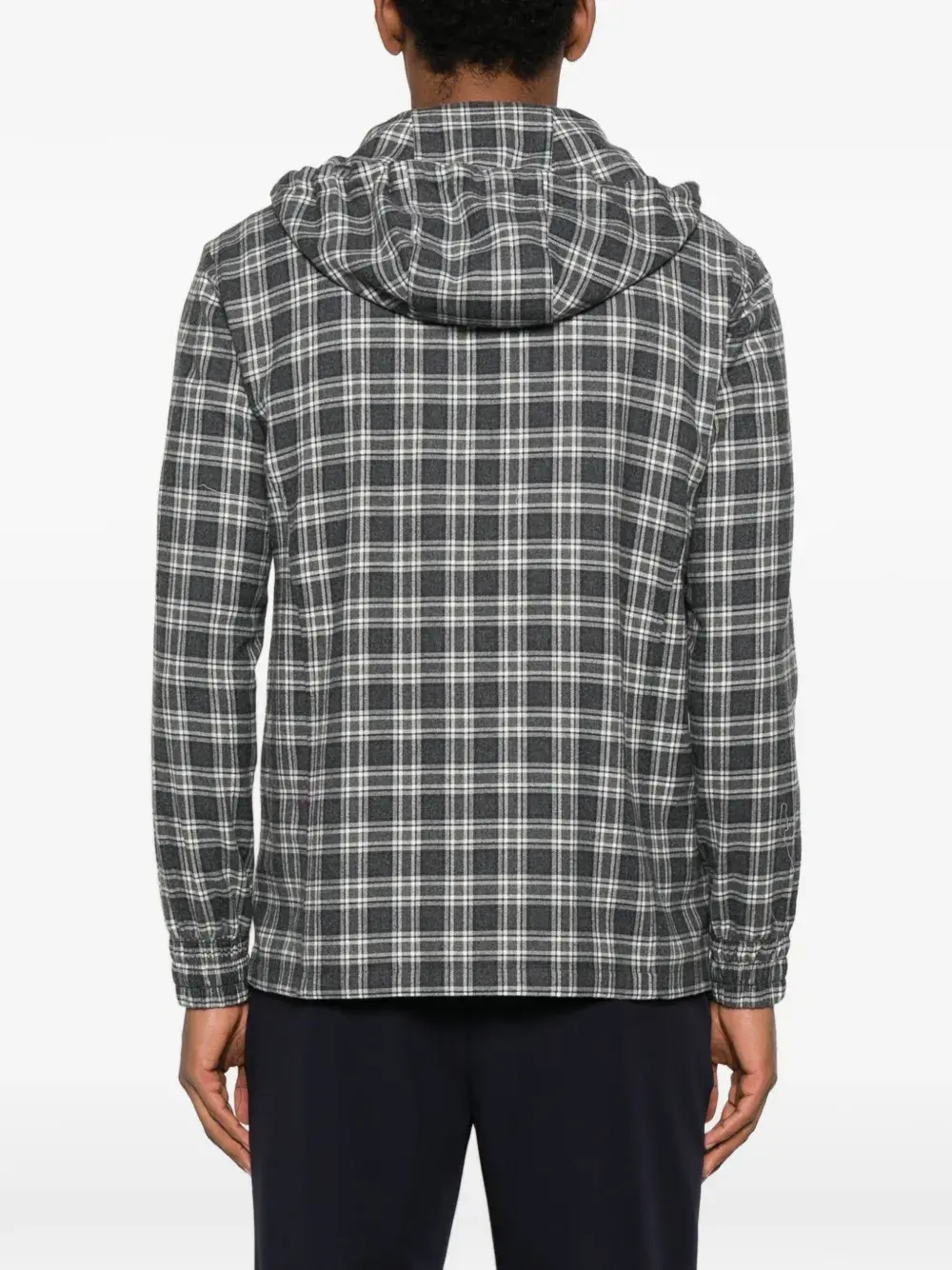 Серая куртка с клетчатым узором, застежкой-молнией, капюшоном, длинными рукавами и манжетами на пуговицах