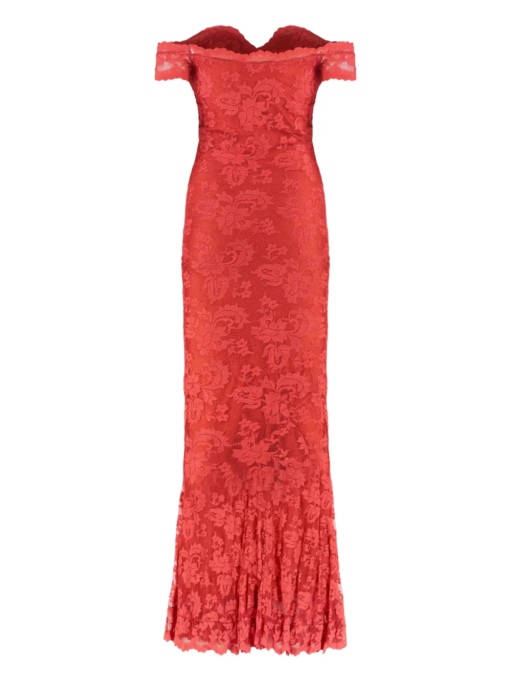 красное кружевное платье с открытыми плечами, цветочным узором, короткими рукавами и оборчатым подолом