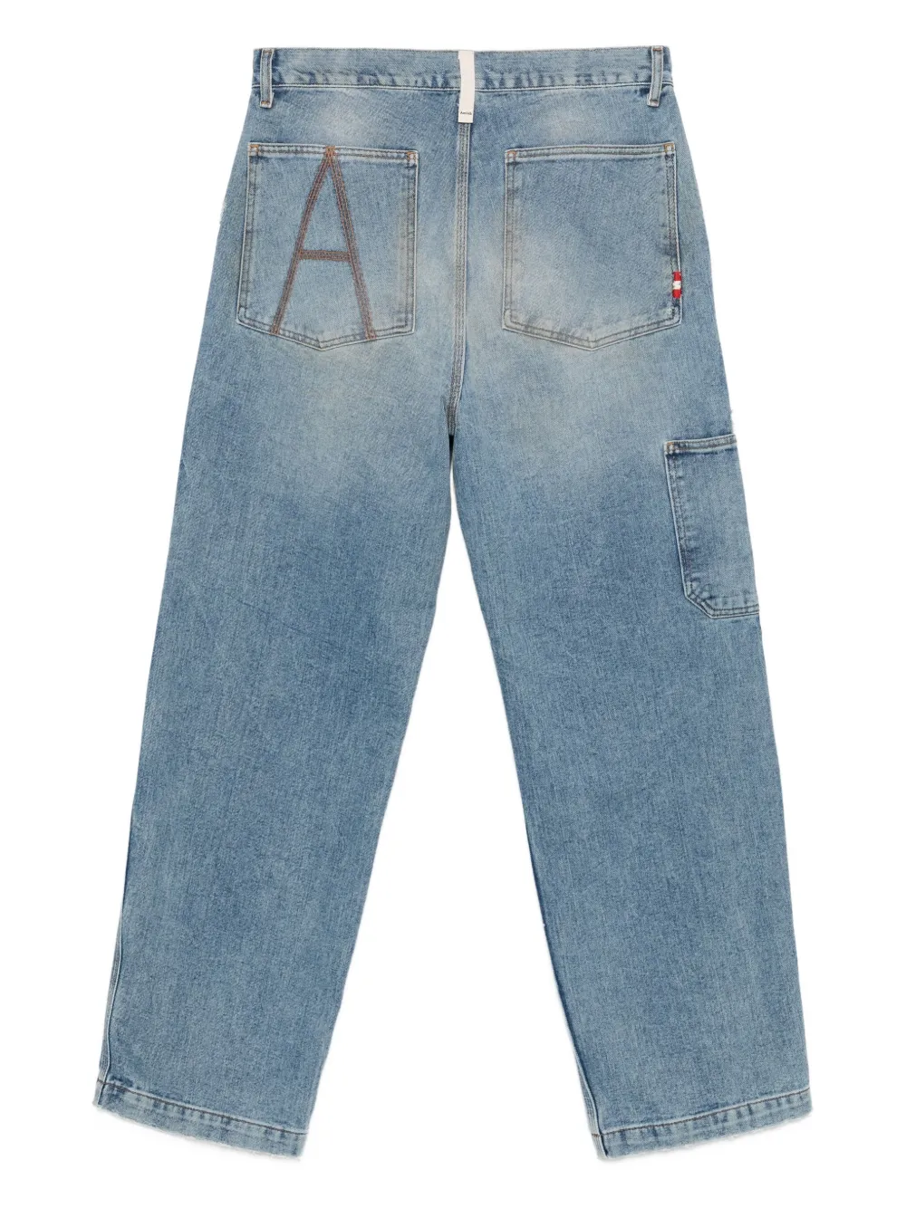 синий цвет, панельный дизайн, пять карманов, шлевки для ремня, задний карман, логотип на спине