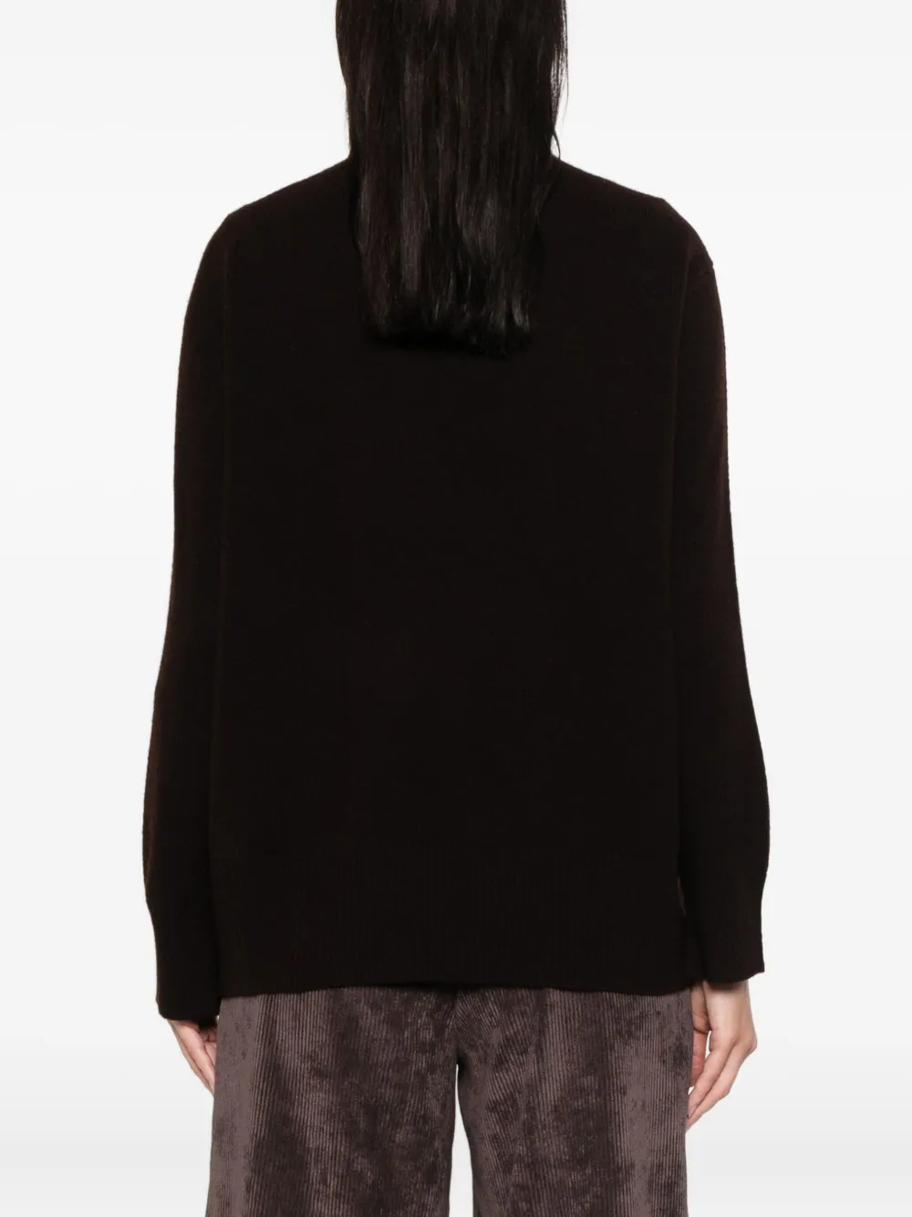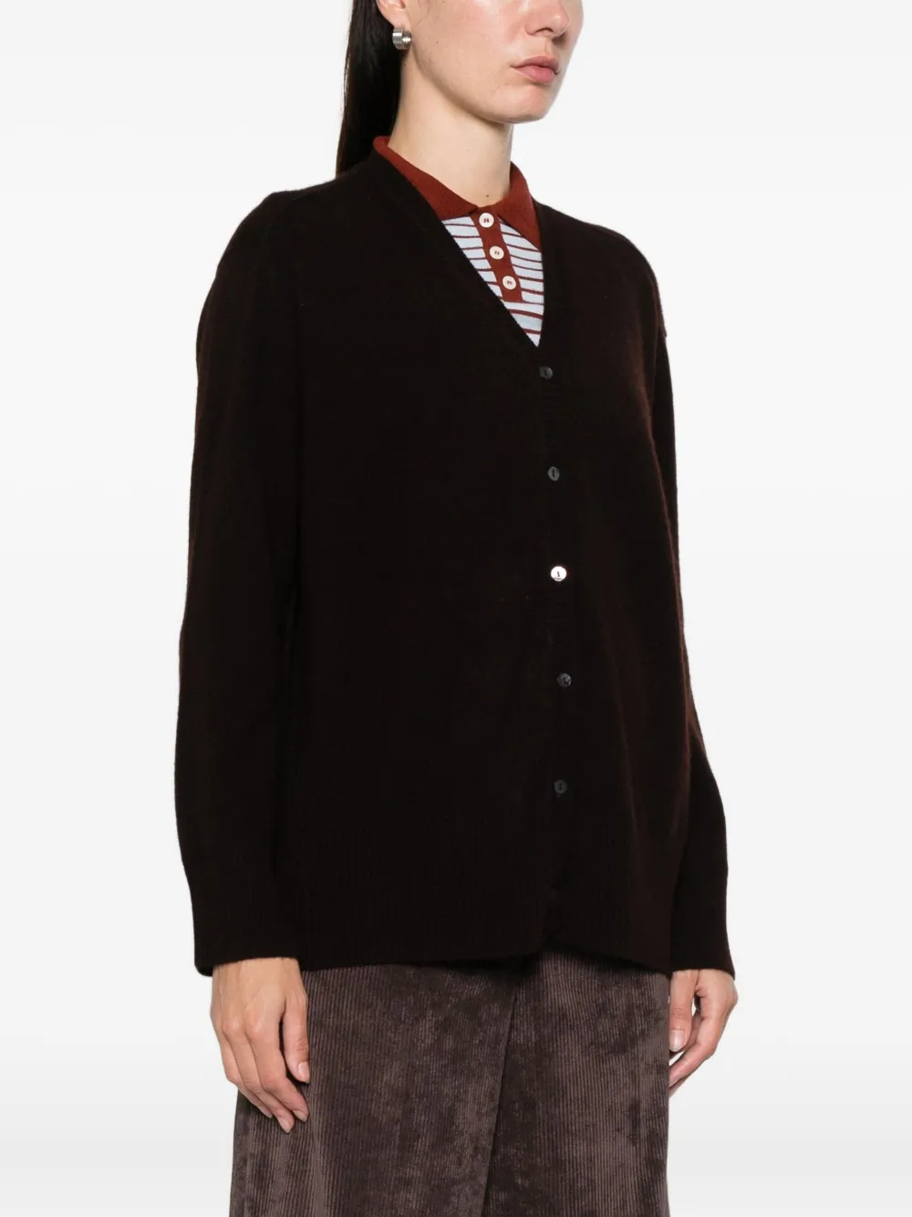 коричневый кардиган с застежкой на пуговицы, V-образным вырезом, длинными рукавами и ребристыми краями
