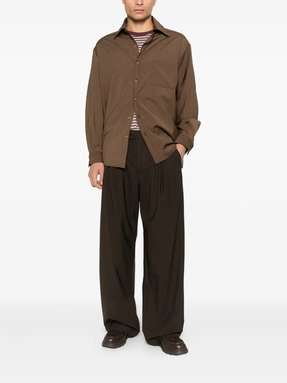 темно-коричневый цвет, плиссированные детали, шлевки для пояса, боковые прорезные карманы, скрытая застежка спереди