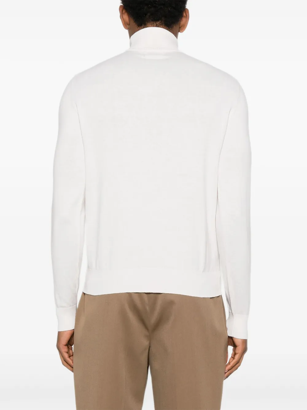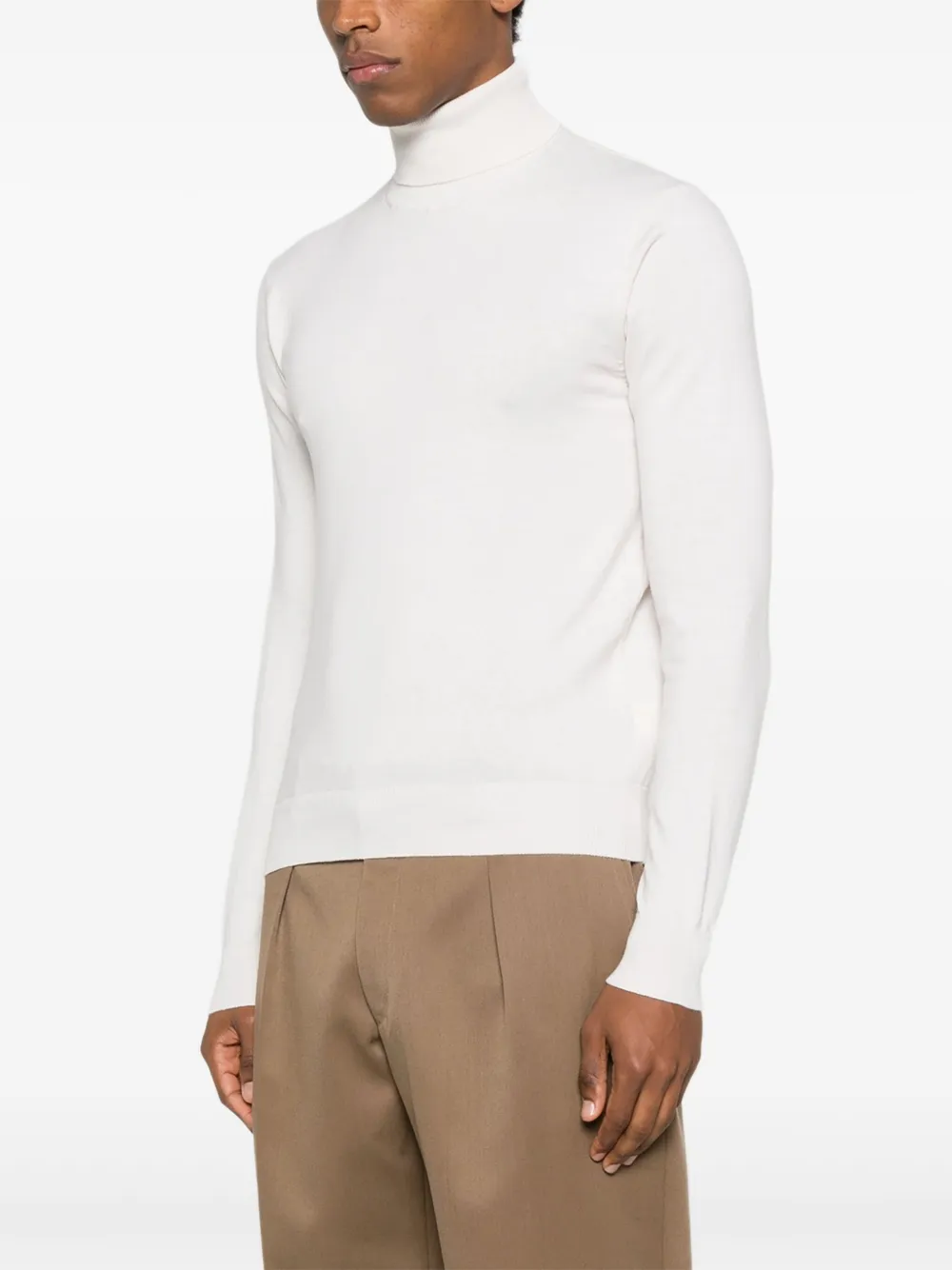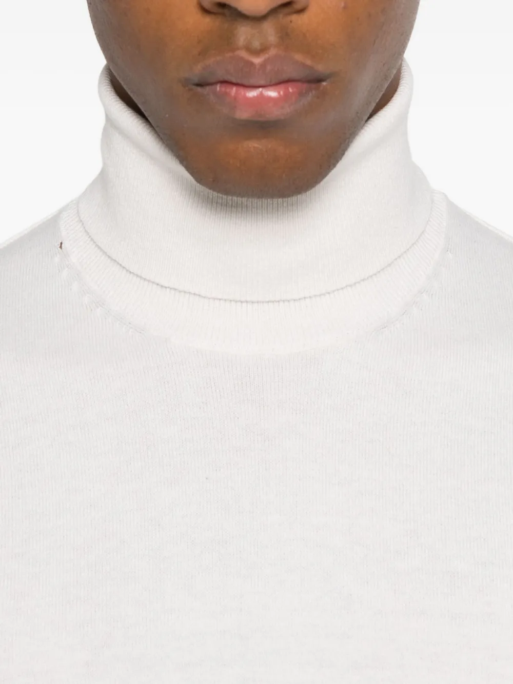 бежевый свитер с высоким воротником, длинными рукавами, ребристыми манжетами и подолом, тонкая вязка