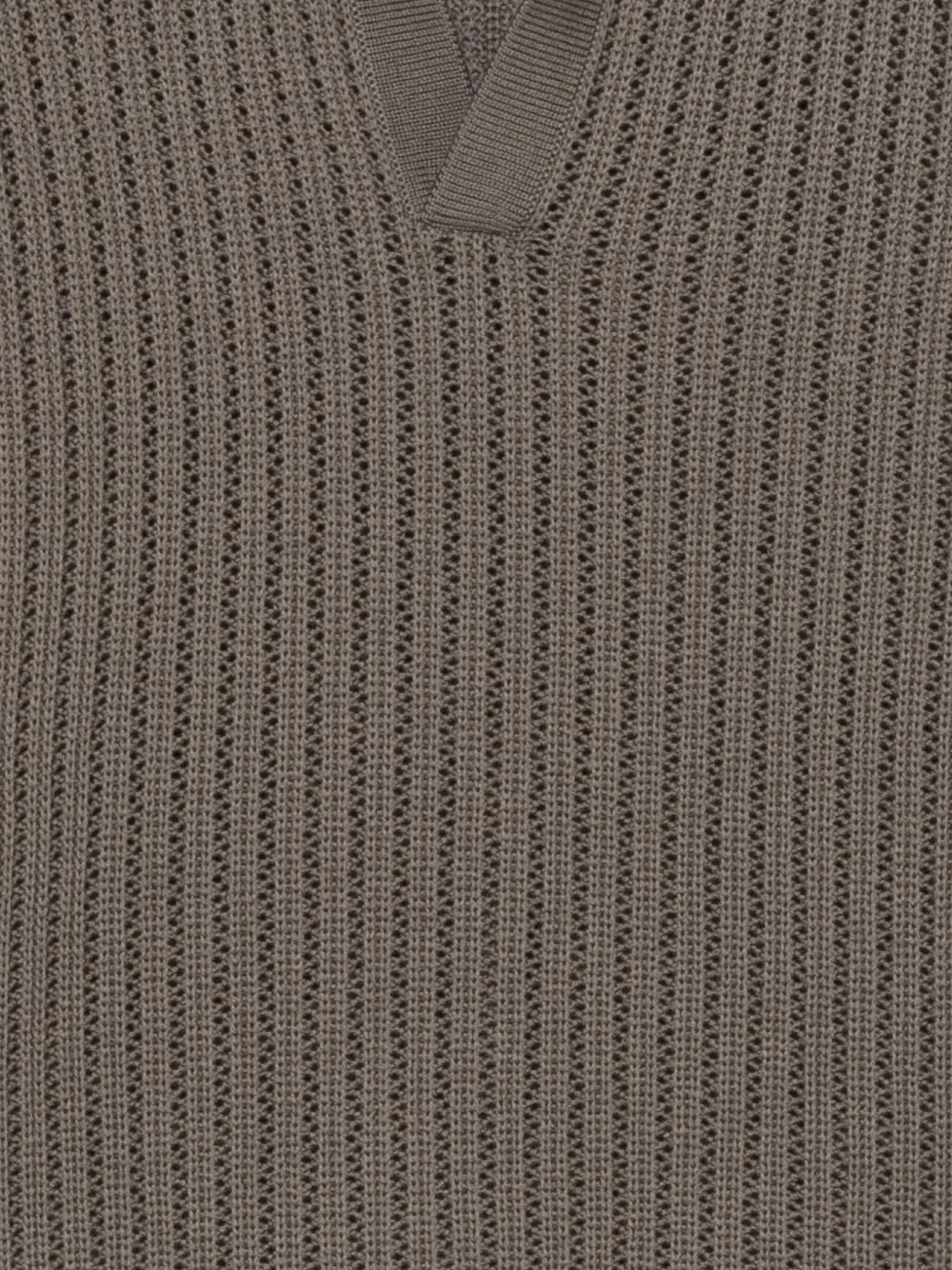 коричневый ажурный трикотажный пуловер с воротником-поло, V-образным вырезом, длинными рукавами и рубчатым низом