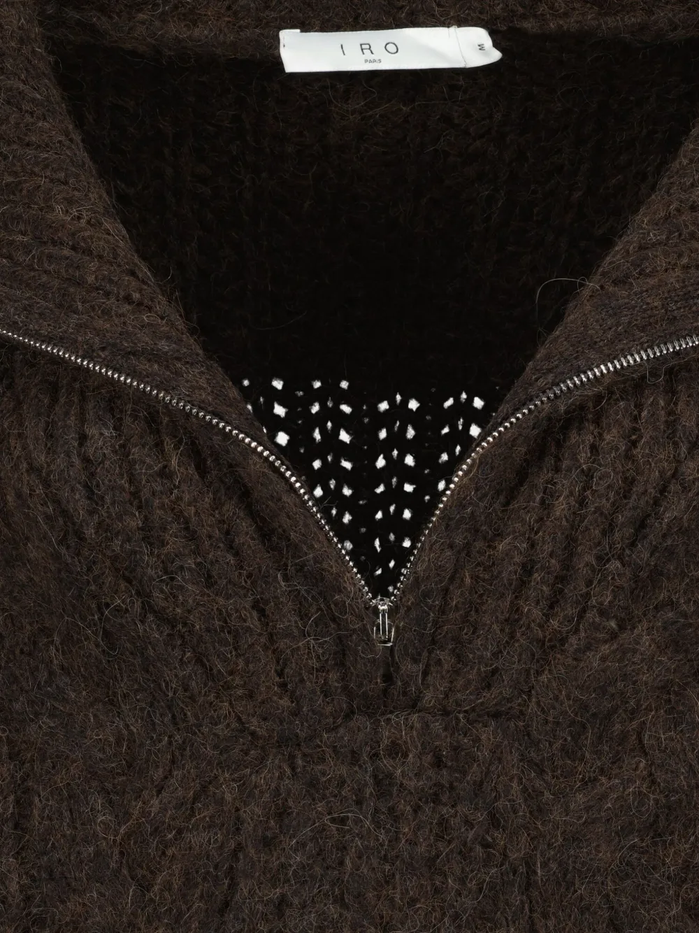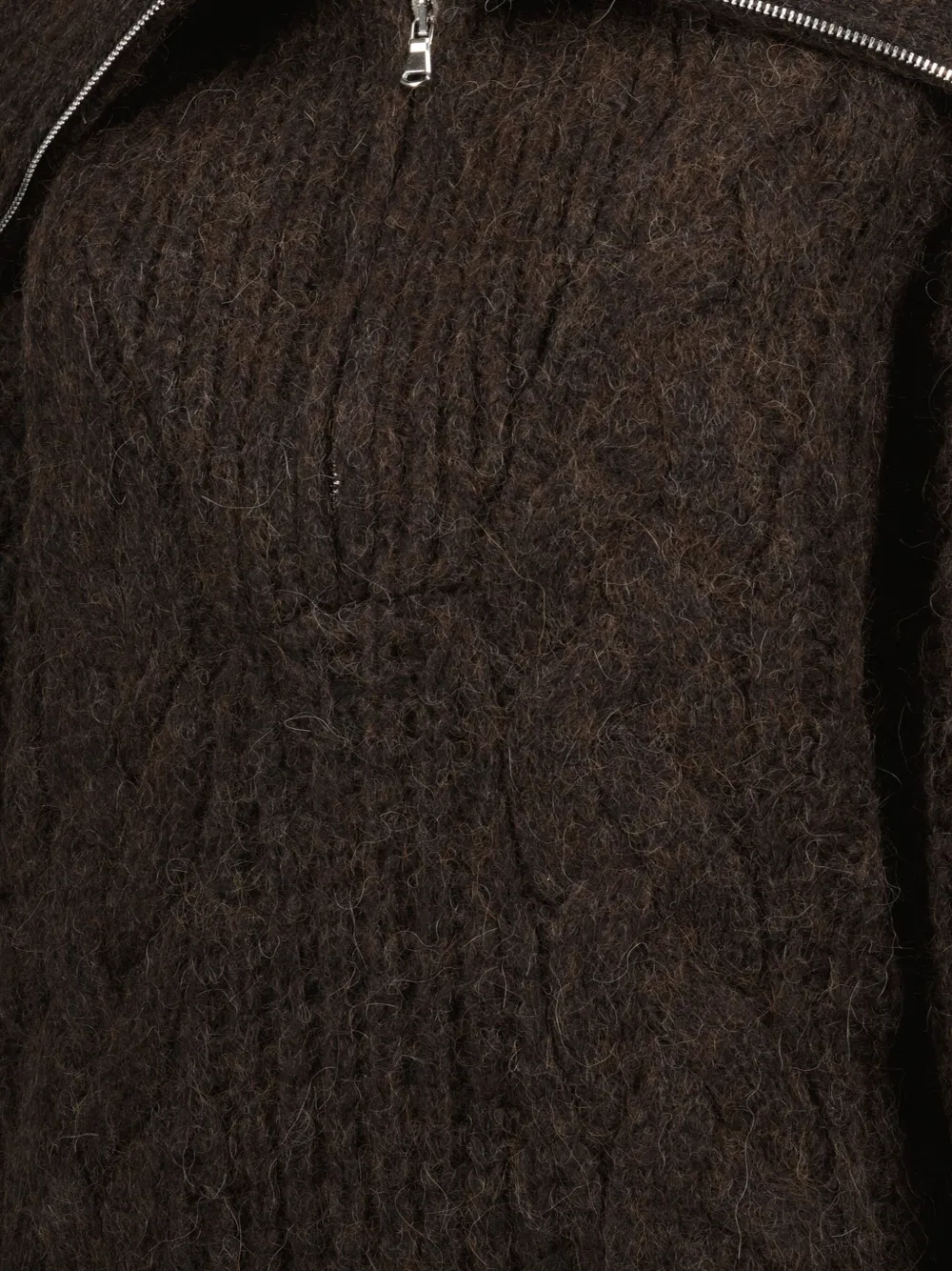 тёмно-коричневый вязаный свитер с аранским узором, высоким воротником, застёжкой-молнией спереди и длинными рукавами