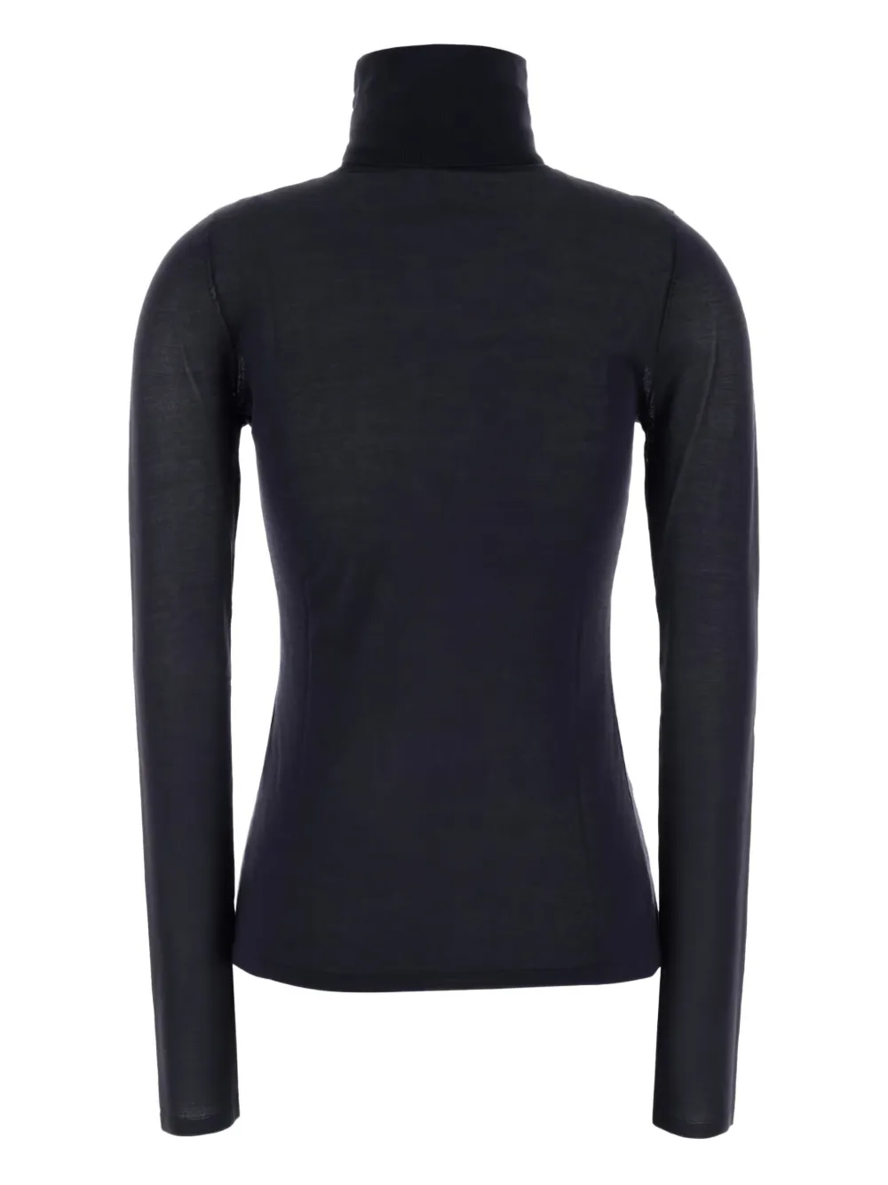 тёмно-синяя вязаная кофта с длинными рукавами, прорезями для больших пальцев и высоким воротом