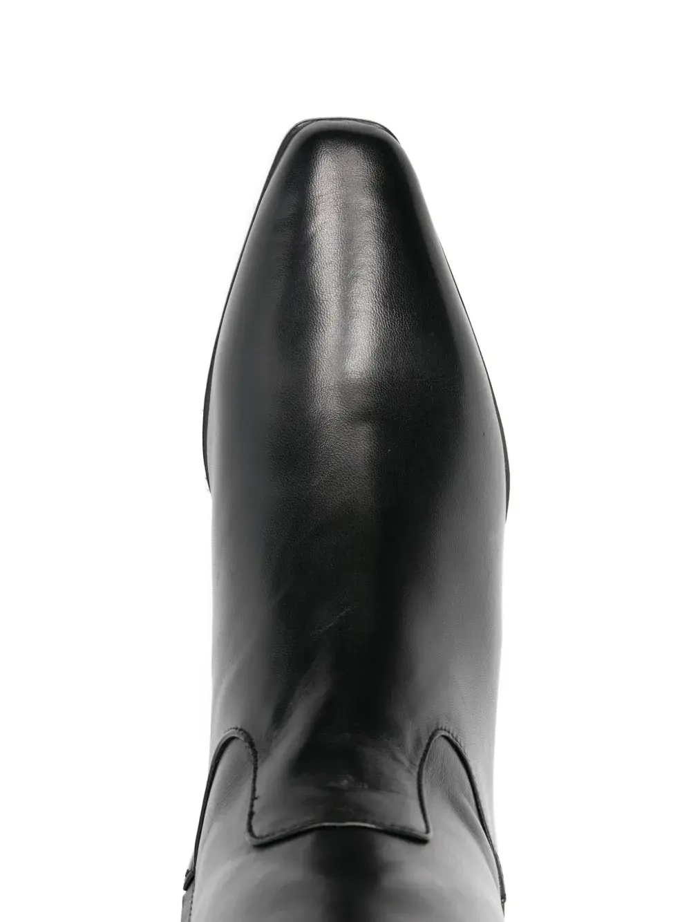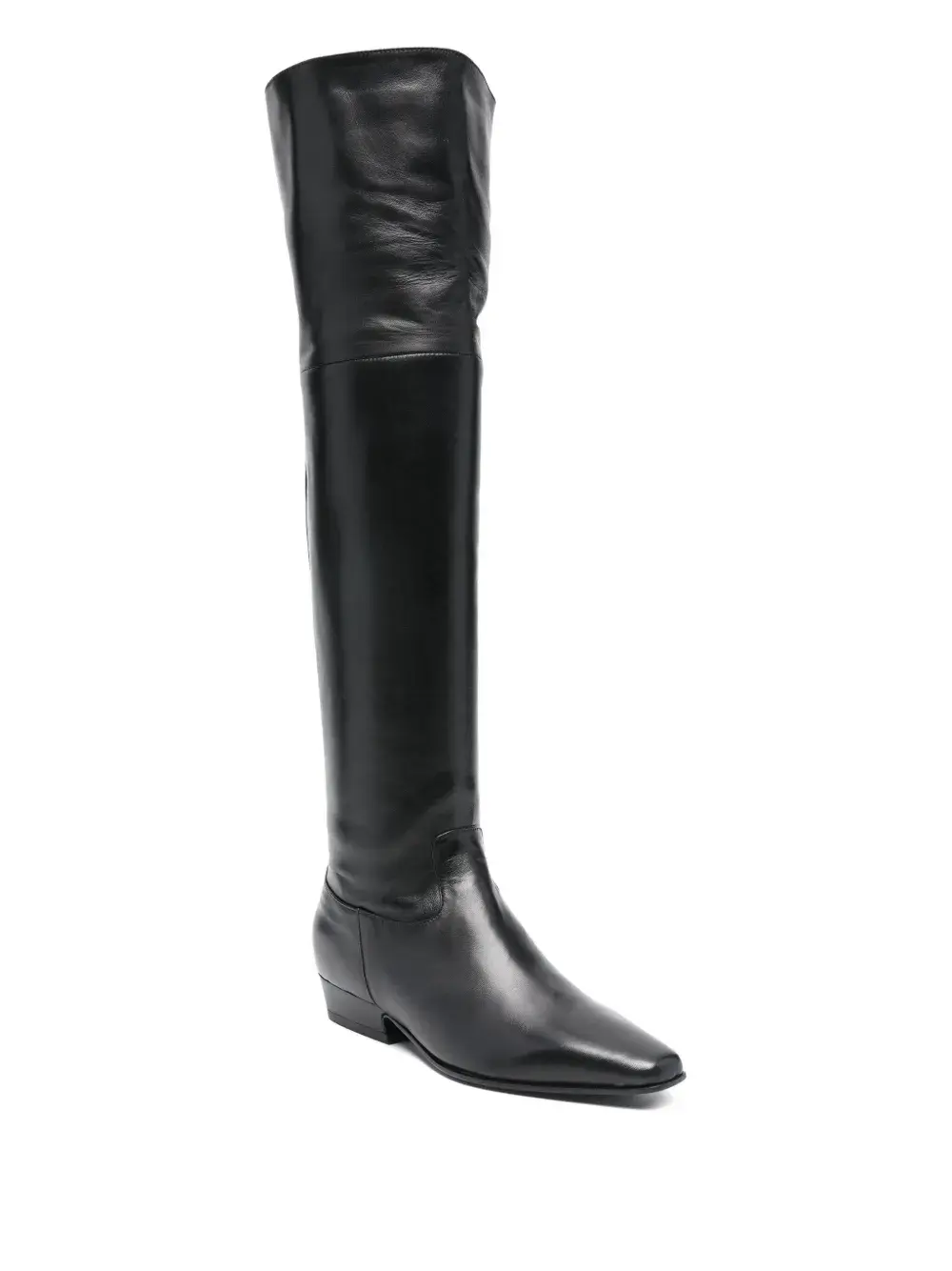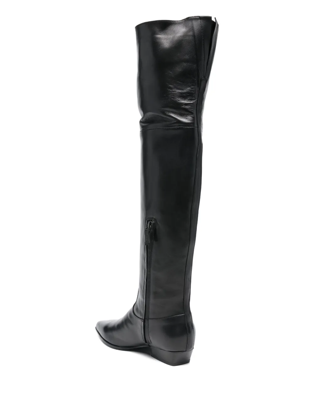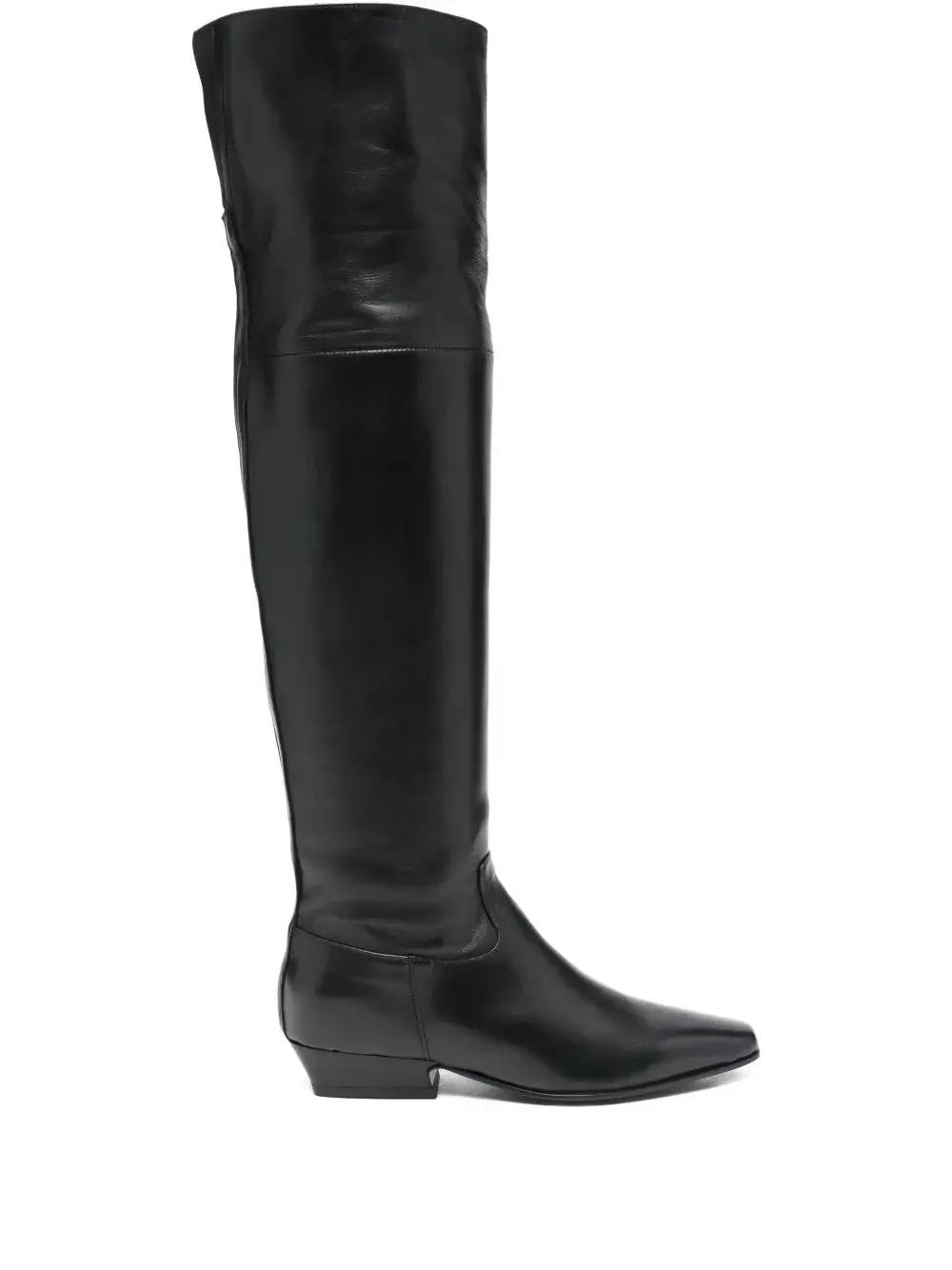 черные ботфорты с заострённым носком, широким каблуком, боковой молнией и дизайном «натяни и носи»