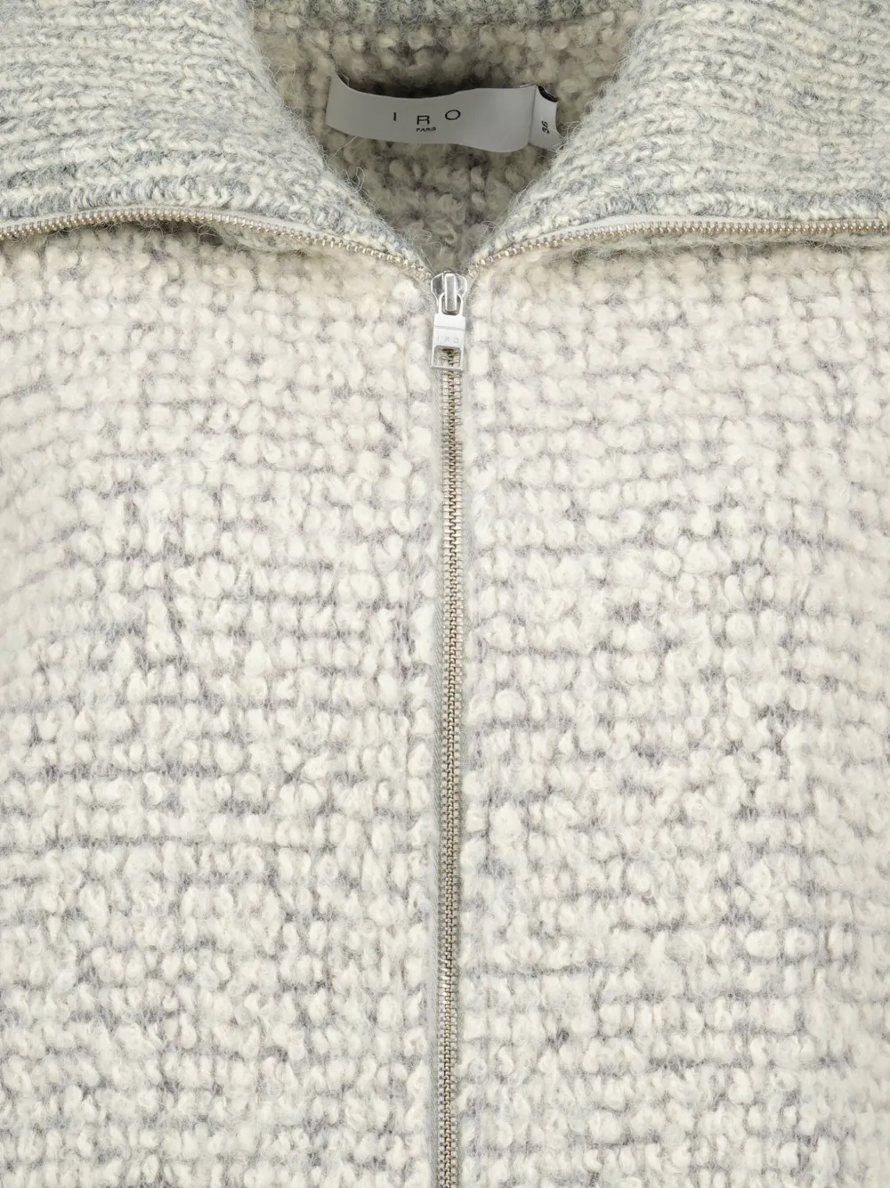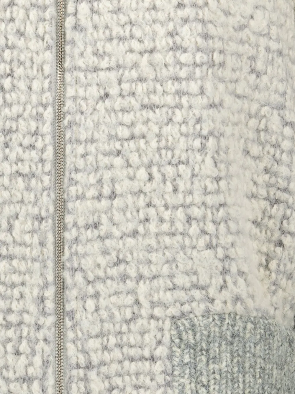 серый букле, фактурная поверхность, ребристые отделки, высокий воротник, застежка на молнию, длинные рукава