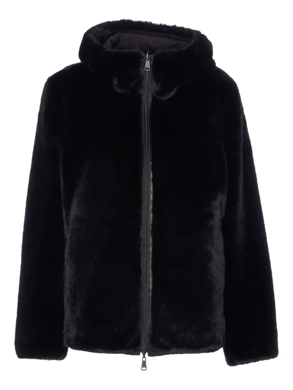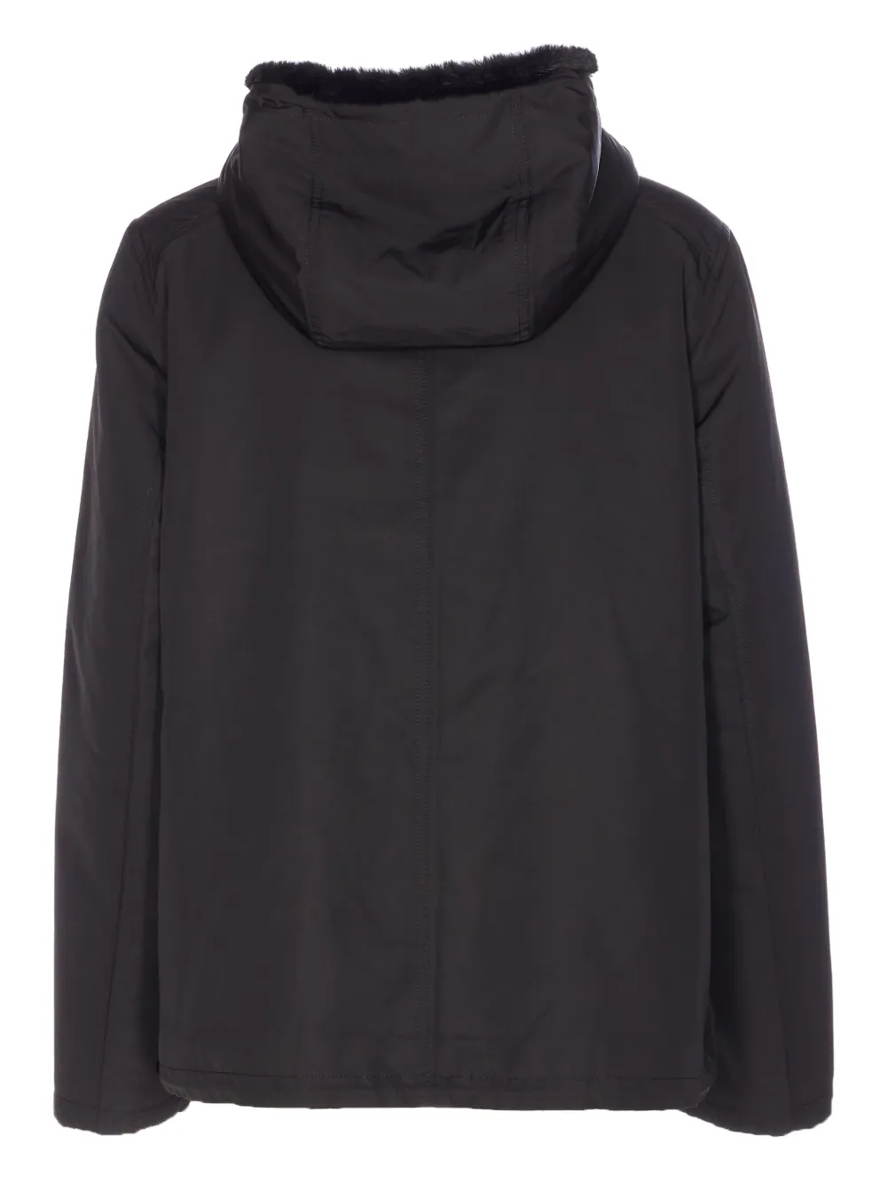 чёрная двусторонняя куртка с капюшоном, застёжкой-молнией, длинными рукавами и карманами на пуговицах