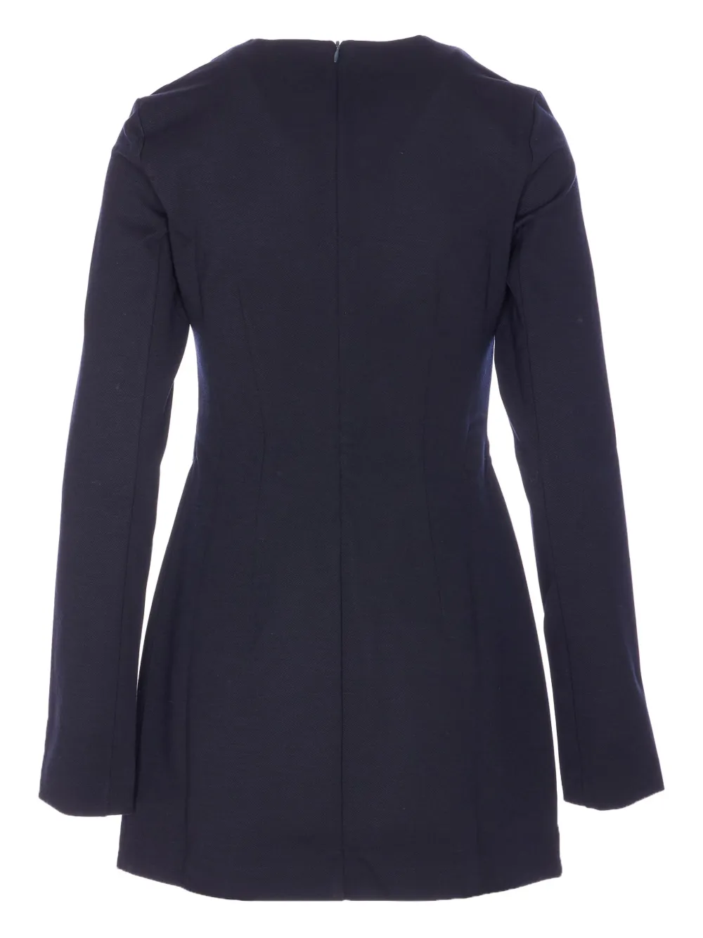 синее мини-платье с круглым вырезом, длинными рукавами и застежкой-молнией