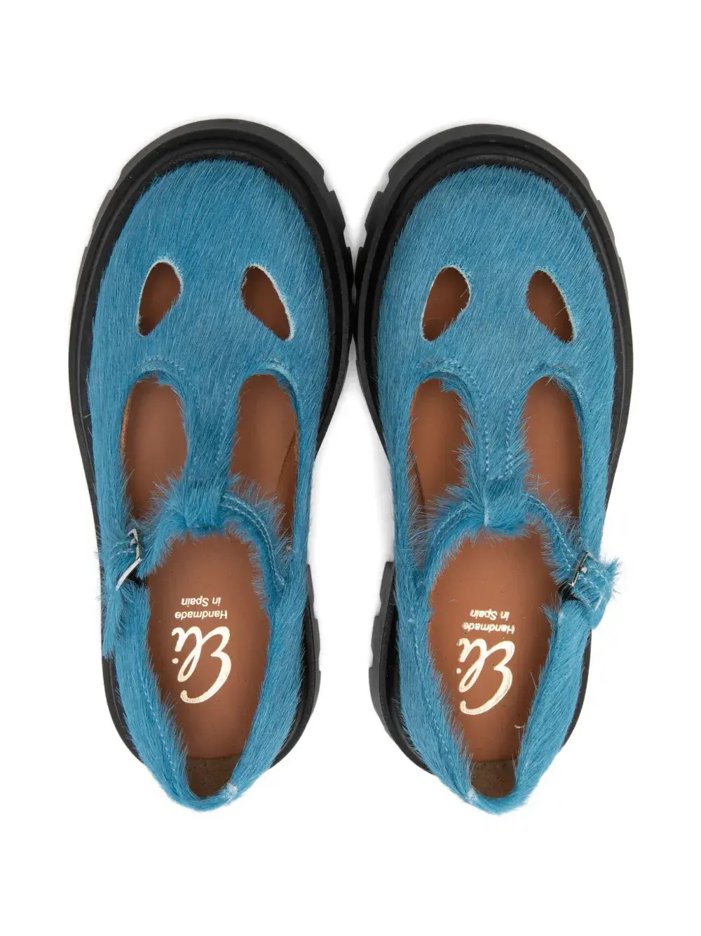 светло-голубой с вырезами, застежка с пряжкой, рифленая подошва, т-образный ремешок, фактура под мех
