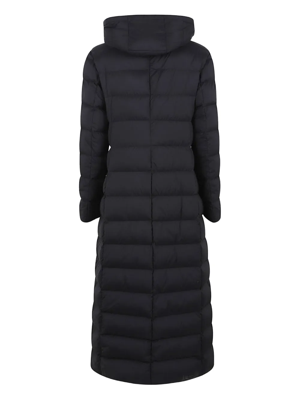 черный пуховик с капюшоном, застежкой на пуговицы, длинными рукавами, стеганым эффектом и удлиненным кроем