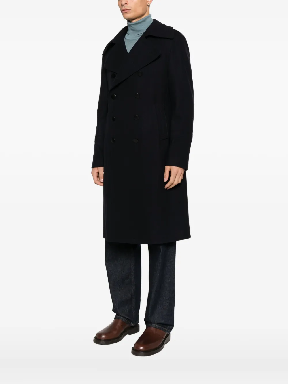 синий двубортный пиджак, застежка на пуговицы, широкие лацканы с вырезом, длинные рукава, прорезные карманы спереди