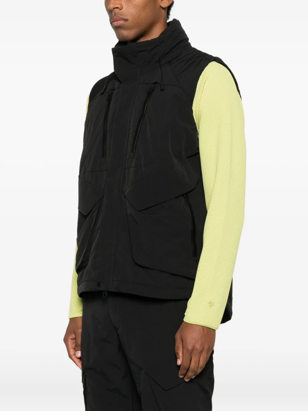 черный цвет, высокий воротник, карманы на молнии спереди, накладные карманы с клапанами, без рукавов, шнурок для регулировки