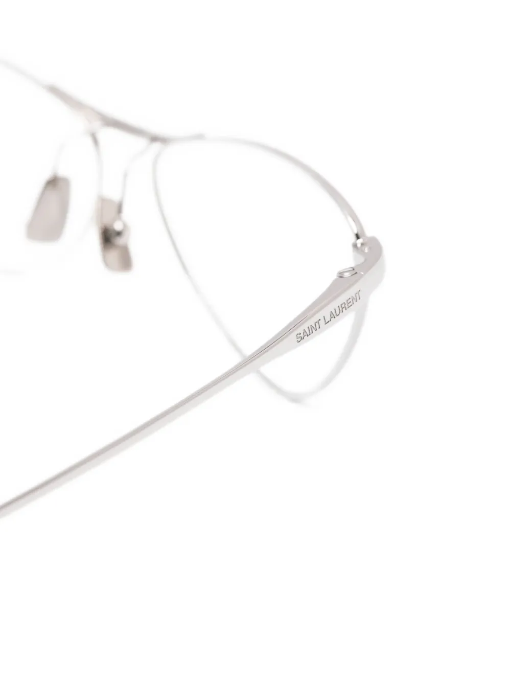 серебристого цвета треугольная оправа, носовые упоры, детали с логотипом, тонкие дужки, все очки на FARFETCH продаются без корректирующих линз, очки поставляются в защитном футляре
