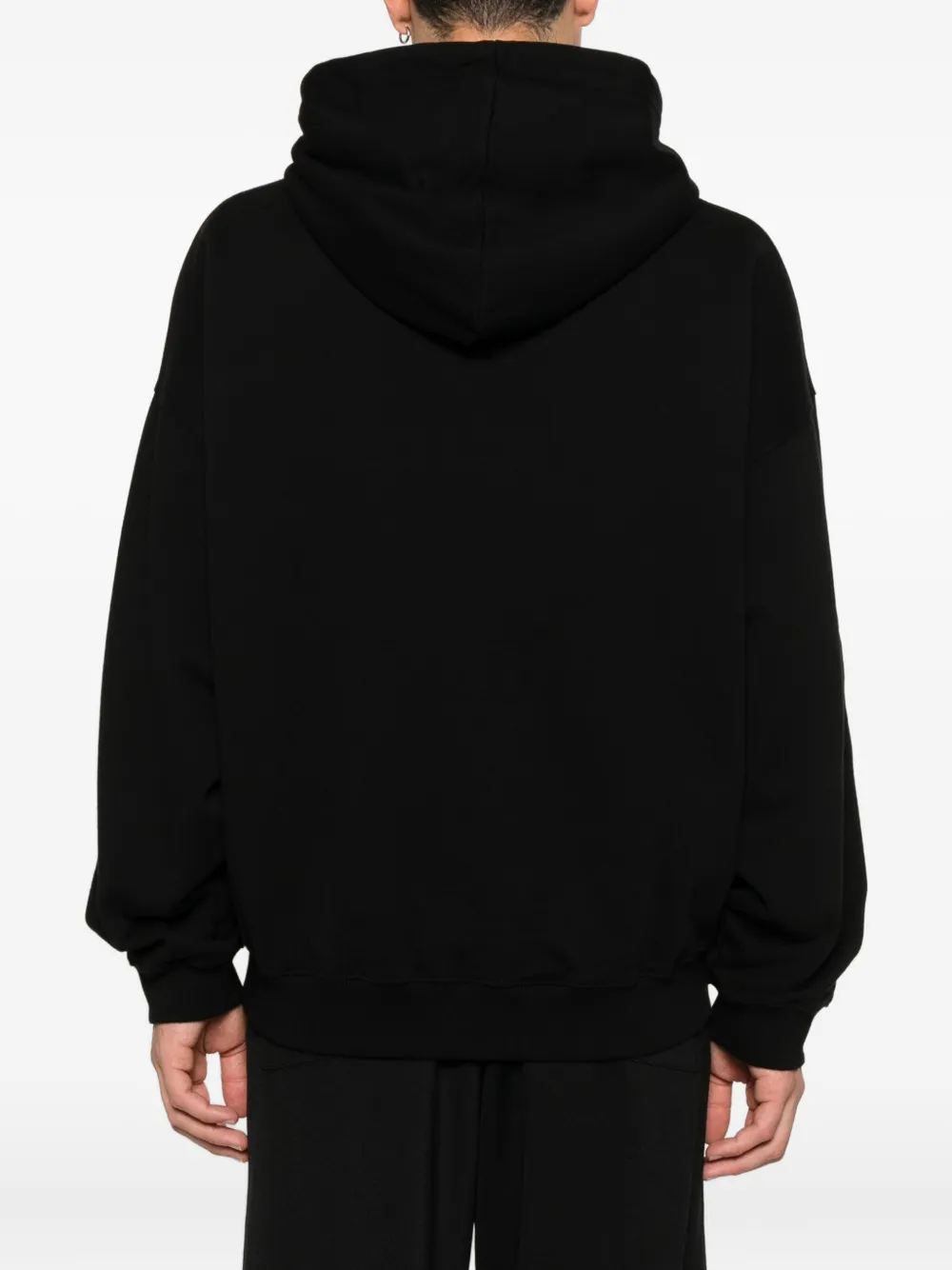 черный худи с логотипом, шнурком на капюшоне, накладным карманом-кенгуру, длинными рукавами и ребристым низом