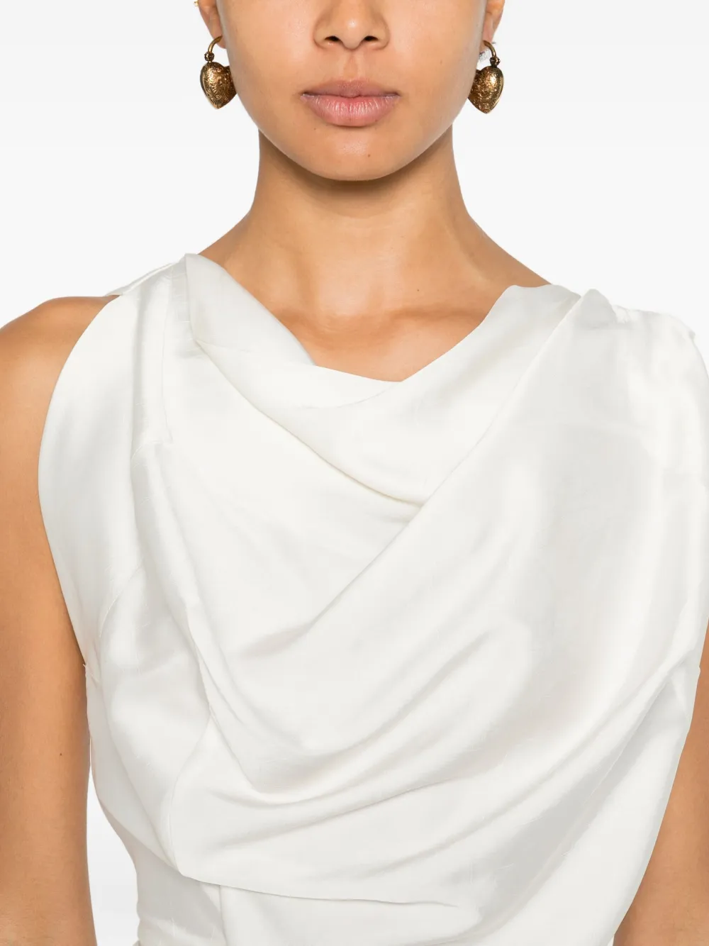 айвори топ без рукавов с драпировкой, глубоким вырезом и сборками