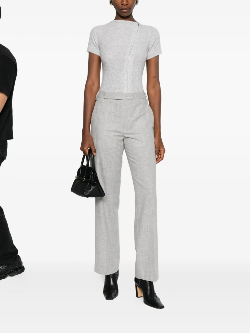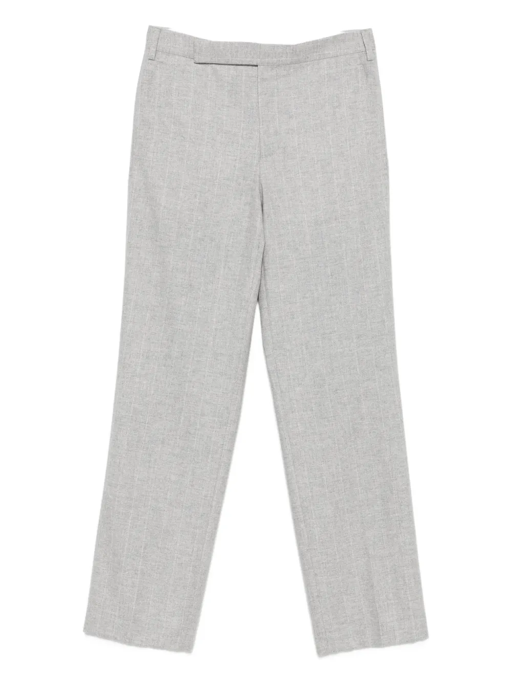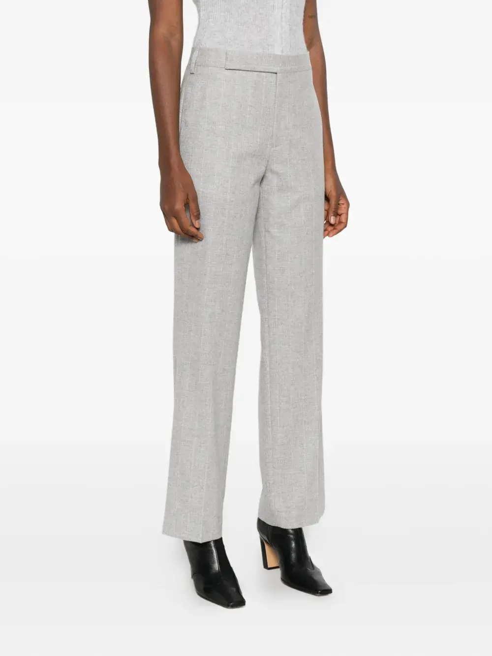 светло-серые брюки в полоску, шлевки для ремня, прямой крой, скрытая застежка, боковые карманы