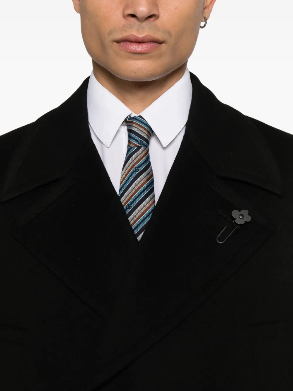 чёрный двубортный пиджак с лацканами, застёжкой на пуговицы спереди и декоративной булавкой в виде цветка