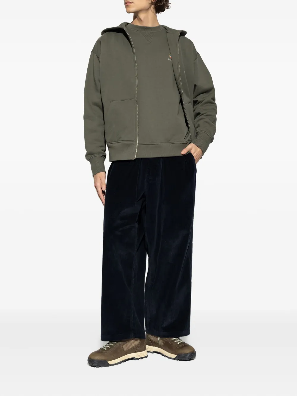 оливково-зелёный цвет, вышитый логотип, круглый вырез, длинные рукава, ребристые манжеты, ребристый низ